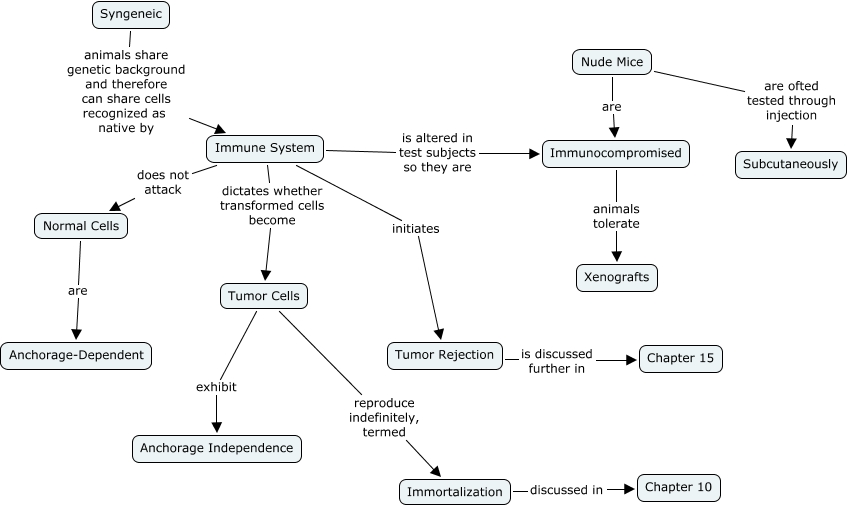 This Concept Map, created with IHMC CmapTools, has information related to: Chapter 3-05 SKM, Immune System is altered in test subjects so they are Immunocompromised, Tumor Cells reproduce indefinitely, termed Immortalization, Tumor Cells exhibit Anchorage Independence, Normal Cells are Anchorage-Dependent, Immortalization discussed in Chapter 10, Immune System dictates whether transformed cells become Tumor Cells, Syngeneic animals share genetic background and therefore can share cells recognized as native by Immune System, Nude Mice are ofted tested through injection Subcutaneously, Immune System does not attack Normal Cells, Tumor Rejection is discussed further in Chapter 15, Immunocompromised animals tolerate Xenografts, Immune System initiates Tumor Rejection, Nude Mice are Immunocompromised
