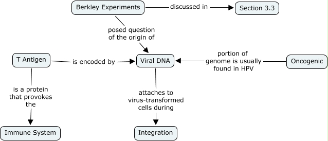 This Concept Map, created with IHMC CmapTools, has information related to: Chapter 3-06 SKM, T Antigen is a protein that provokes the Immune System, Viral DNA attaches to virus-transformed cells during Integration, Berkley Experiments discussed in Section 3.3, Oncogenic portion of genome is usually found in HPV Viral DNA, T Antigen is encoded by Viral DNA, Berkley Experiments posed question of the origin of Viral DNA