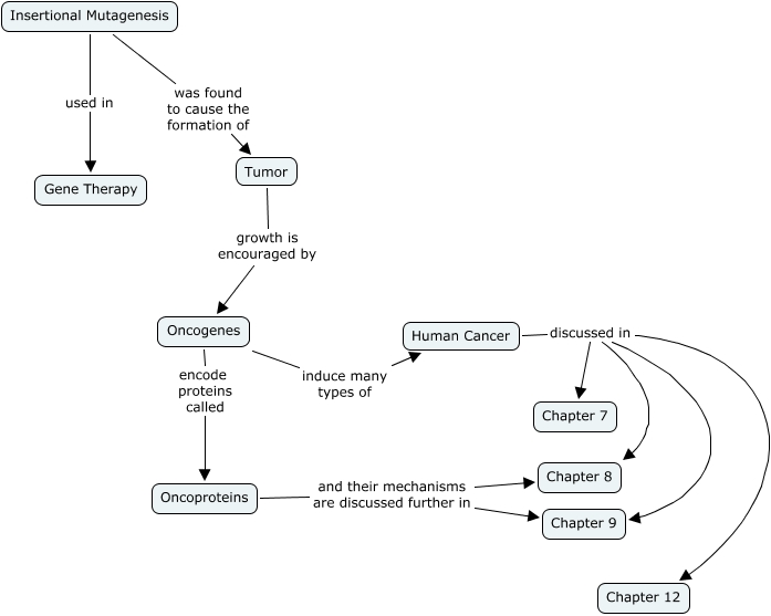 This Concept Map, created with IHMC CmapTools, has information related to: Chapter 3-13 SKM, Oncoproteins and their mechanisms are discussed further in Chapter 9, Human Cancer discussed in Chapter 9, Oncogenes encode proteins called Oncoproteins, Oncogenes induce many types of Human Cancer, Human Cancer discussed in Chapter 7, Oncoproteins and their mechanisms are discussed further in Chapter 8, Human Cancer discussed in Chapter 12, Tumor growth is encouraged by Oncogenes, Insertional Mutagenesis was found to cause the formation of Tumor, Insertional Mutagenesis used in Gene Therapy, Human Cancer discussed in Chapter 8