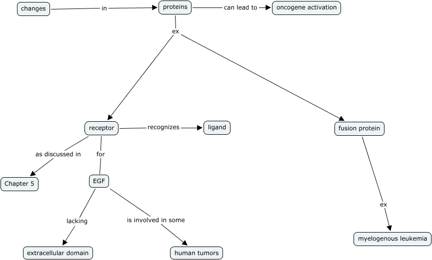 This Concept Map, created with IHMC CmapTools, has information related to: Chapter 4-6, proteins ex fusion protein, proteins ex receptor, receptor as discussed in Chapter 5, EGF is involved in some human tumors, proteins can lead to oncogene activation, receptor for EGF, changes in proteins, fusion protein ex myelogenous leukemia, EGF lacking extracellular domain, receptor recognizes ligand