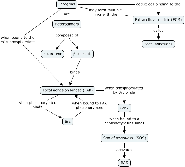 This Concept Map, created with IHMC CmapTools, has information related to: Section 6-9, Son of sevenless (SOS) activates RAS, β sub-unit binds Focal adhesion kinase (FAK), Integrins detect cell binding to the Extracellular matrix (ECM), Focal adhesion kinase (FAK) when phosphorylated by Src binds Grb2, Src when bound to FAK phosphorylates Focal adhesion kinase (FAK), Focal adhesion kinase (FAK) when phosphorylated binds Src, Integrins are Heterodimers, Integrins when bound to the ECM phosphorylate Focal adhesion kinase (FAK), Grb2 when bound to a phosphotyrosine binds Son of sevenless (SOS), Heterodimers composed of α sub-unit, Integrins may form multiple links with the Extracellular matrix (ECM), Heterodimers composed of β sub-unit, Extracellular matrix (ECM) called Focal adhesions