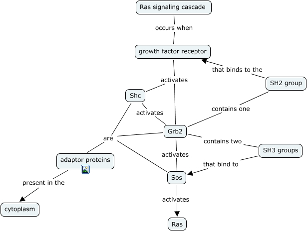 This Concept Map, created with IHMC CmapTools, has information related to: Section 6.4, Grb2 are adaptor proteins, growth factor receptor activates Shc, Ras signaling cascade occurs when growth factor receptor, SH3 groups that bind to Sos, Shc activates Grb2, Grb2 activates Sos, Grb2 contains one SH2 group, Shc are adaptor proteins, growth factor receptor activates Grb2, adaptor proteins present in the cytoplasm, SH2 group that binds to the growth factor receptor, Grb2 contains two SH3 groups, Sos are adaptor proteins, Sos activates Ras
