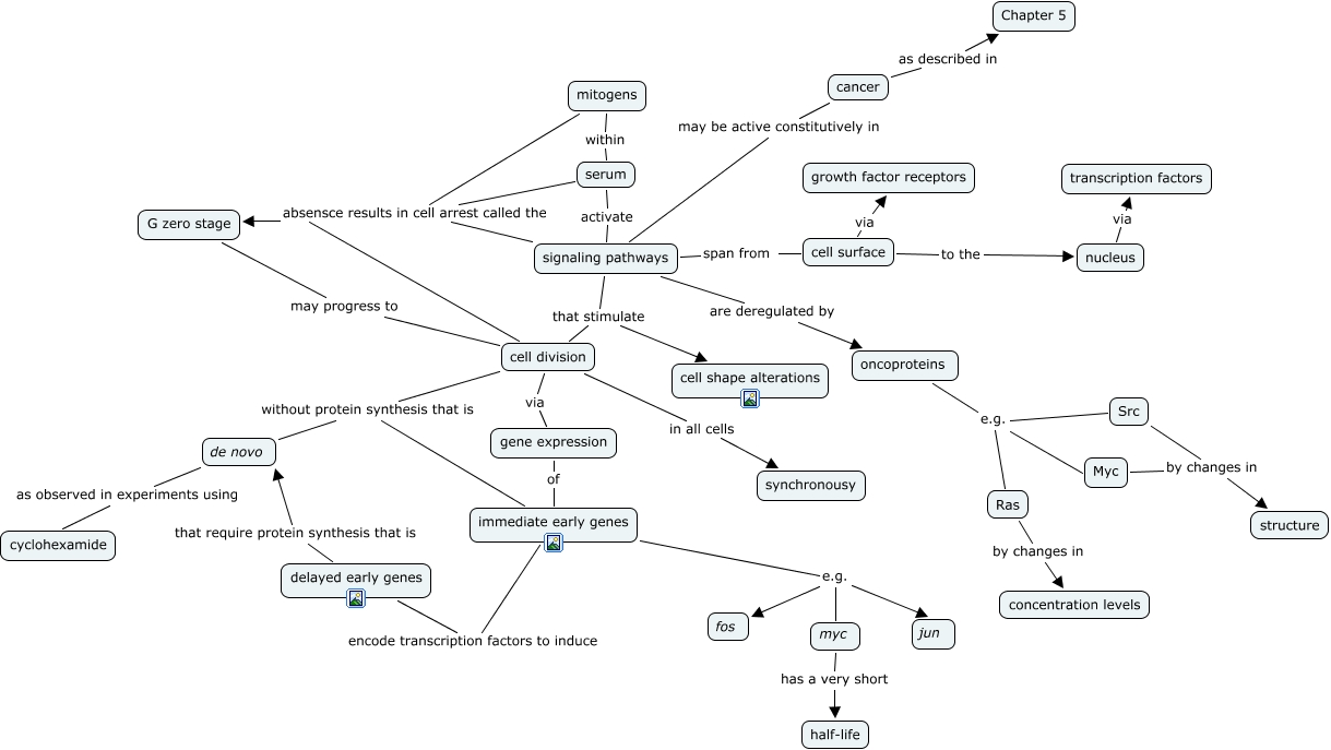 This Concept Map, created with IHMC CmapTools, has information related to: Section 6.1, signaling pathways absensce results in cell arrest called the G zero stage, serum absensce results in cell arrest called the G zero stage, oncoproteins e.g. Ras, immediate early genes e.g. myc, signaling pathways that stimulate cell division, mitogens within serum, cell division via gene expression, signaling pathways are deregulated by oncoproteins, cell surface via growth factor receptors, cell division in all cells synchronousy, serum activate signaling pathways, immediate early genes e.g. jun, mitogens absensce results in cell arrest called the G zero stage, G zero stage may progress to cell division, oncoproteins e.g. Myc, immediate early genes e.g. fos, immediate early genes without protein synthesis that is de novo, gene expression of immediate early genes, signaling pathways span from cell surface, immediate early genes encode transcription factors to induce delayed early genes