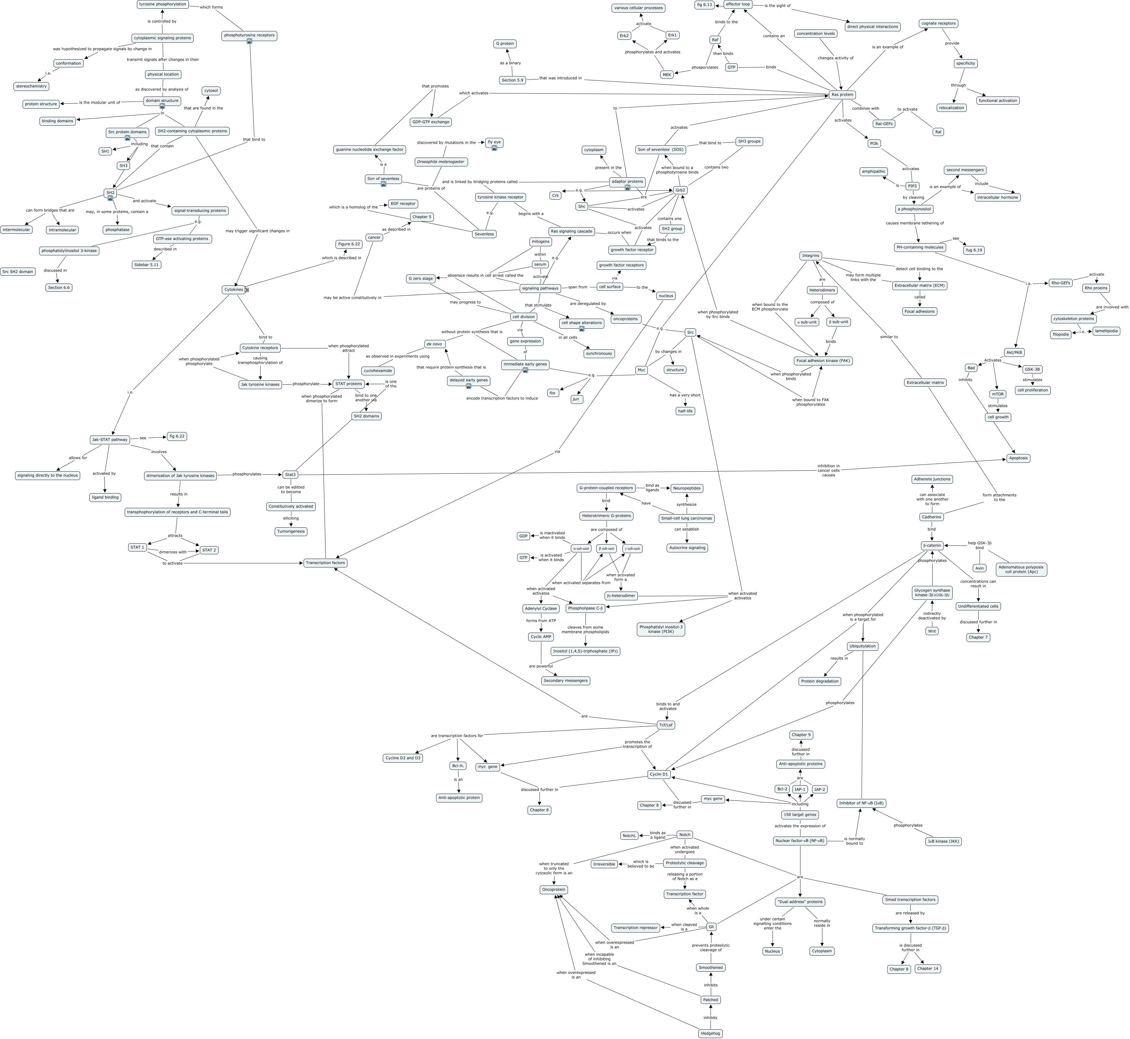 This Concept Map, created with IHMC CmapTools, has information related to: Chapter 6 Merged Map, phosphatidylinositol 3-kinase discussed in Section 6.6, domain structure is the modular unit of protein structure, domain structure in binding domains, Nuclear factor-κB (NF-κB) are "Dual address" proteins, Src protein domains including SH3, Ras protein that was introduced in Section 5.9, cell division without protein synthesis that is de novo, 150 target genes including IAP-2, G-protein-coupled receptors bind Heterotrimeric G-proteins, Ubiquitylation results in Protein degradation, SH2 can form bridges that are intramolecular, Heterodimers composed of β sub-unit, STAT 1 to activate Transcription factors, Bcl-2 are Anti-apoptotic proteins, "Dual address" proteins normally reside in Cytoplasm, concentration levels changes activity of Ras protein, Tcf/Lef promotes the transcription of Cyclin D1, βγ-heterodimer when activated activates Src, PH-containing molecules i.e. Akt/PKB, α sub-unit when activated activates Phospholipase C-β