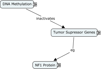 This Concept Map, created with IHMC CmapTools, has information related to: Sections 8-10 SKM, Tumor Supressor Genes have various mechanisms of Function, Maintenance Methylation occurs on CpGs, Neurofibromatosis Type 1 features development of Abnormalities, NF1 Gene produces Neurofibromin, NF1 Gene causes Neurofibromatosis Type 1, CpGs occur in high density sites called CpG Islands, DNA Methylation inactivates Tumor Supressor Genes, Abnormalities eg Lisch Nodules, Neurofibrosarcomas can put patients at risk for Glioblastomas, NF1 Gene behaves similarly to Ra Gene, DNA Methylation eg de novo Methylases, Ras Signaling is discussed in Section 5.9, p53 Gene aka TP53, DNA Methylation eg Maintenance Methylation, NF1 Protein present in half- concentration is an example of Haploinsufficiency, Promoter Methylation is a mechanism for Inactivation, CpG Islands are found in Tumors, GTPase-Activating Proteins (GAPs) eg Ras GAP, Neurofibromatosis Type 1 features development of Benign Tumors, DNA Methylation eg Promoter Methylation