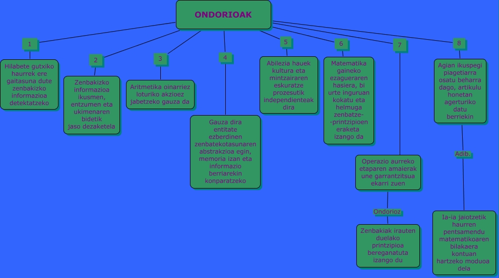 Este mapa conceptual tiene información relacionada a: Ondorioak, ONDORIOAK 5 Abilezia hauek kultura eta mintzairaren eskuratze prozesutik independienteak dira, Operazio aurreko etaparen amaierak une garrantzitsua ekarri zuen Ondorioz Zenbakiak irauten duelako printzipioa bereganatuta izango du, Agian ikuspegi piagetiarra osatu beharra dago, artikulu honetan agerturiko datu berriekin Adib. Ia-ia jaiotzetik haurren pentsamendu matematikoaren bilakaera kontuan hartzeko moduoa dela, ONDORIOAK 1 Hilabete gutxiko haurrek ere gaitasuna dute zenbakizko informazioa detektatzeko, ONDORIOAK 6 Matematika gaineko ezagueraren hasiera, bi urte inguruan kokatu eta helmuga zenbatze- -printzipioen eraketa izango da, ONDORIOAK 7 ????, ONDORIOAK 3 Aritmetika oinarriez loturiko akzioez jabetzeko gauza da, ONDORIOAK 4 Gauza dira entitate ezberdinen zenbatekotasunaren abstrakzioa egin, memoria izan eta informazio berriarekin konparatzeko, ONDORIOAK 8 Agian ikuspegi piagetiarra osatu beharra dago, artikulu honetan agerturiko datu berriekin, ONDORIOAK 2 Zenbakizko informazioa ikusmen, entzumen eta ukimenaren bidetik jaso dezaketela