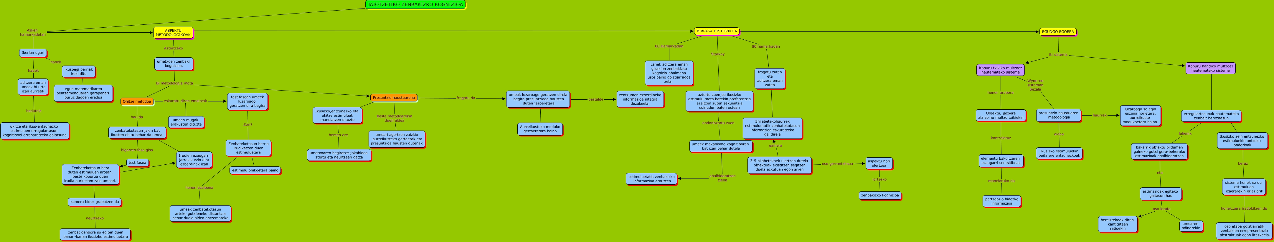 Este mapa conceptual tiene información relacionada a: JAIOTZETIKO ZENBAKIZKO KOGNIZIOA, Ohitze metodoa hau da zenbatekotasun jakin bat ikusten ohitu behar da umea., Ikerlan ugari honek ikuspegi berriak ireki ditu, presuntzio haustuaren metodologia haurrek luzaroago so egin eszena horietara, aurreikuste modukoetara baino., elementu bakoitzaren ezaugarri sentsitiboak maneiatuko du pertzepzio bidezko informazioa, 3-5 hilabetekoek ulertzen dutela objektuak existitzen segitzen duela ezkutuan egon arren oso garrantzitsua aspektu hori ulertzea, Presuntzio haustuarena ???? Ikusizko,entzunezko eta ukitze estimuluak maneiatzen dituzte, Objektu, jazoera ala soinu multzo txikiekin kontrolatuz elementu bakoitzaren ezaugarri sentsitiboak, umeek mekanismo kognitiboren bat izan behar dutela ahalbideratzen ziena estimuluetatik zenbakizko informazioa erauzten, Ikerlan ugari hauek aditzera eman umeek bi urte izan aurretik, umeak luzaroago geratzen direla begira presuntziaoa hausten duten jazoeretara bestalde zentzumen ezberdineko informazioa integra dezakeela.