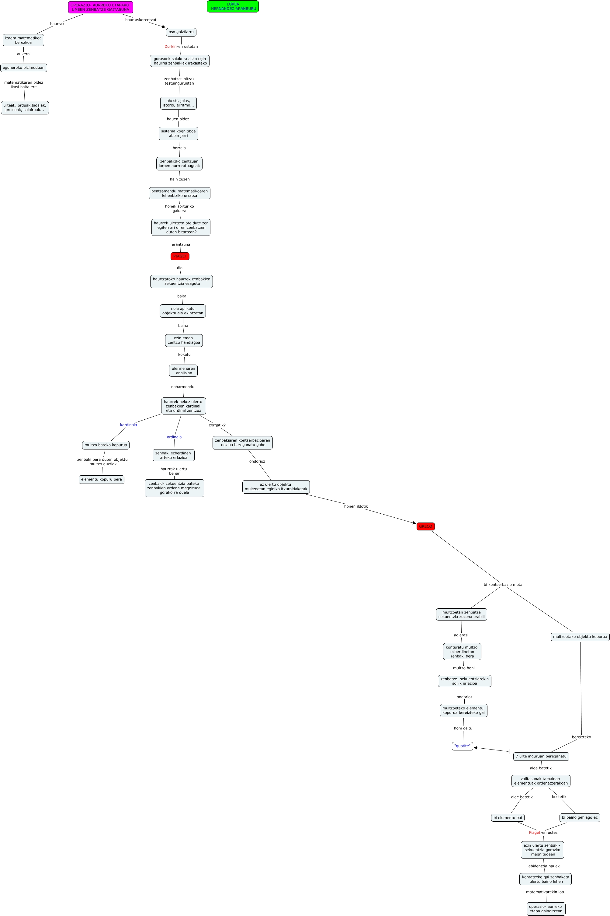 Este mapa conceptual tiene información relacionada a: 1.zatia, ezin eman zentzu handiagoa kokatu ulermenaren analisian, zenbakiaren kontserbazioaren nozioa bereganatu gabe ondorioz ez ulertu objektu multzoetan eginiko itxuraldaketak, sistema kognitiboa abian jarri horrela zenbakizko zentzuan lorpen aurreratuagoak, pentsamendu matematikoaren lehenbiziko urratsa honek sorturiko galdera haurrek ulertzen ote dute zer egiten ari diren zenbatzen duten bitartean?, oso goiztiarra Durkin-en ustetan gurasoek saiakera asko egin haurrei zenbakiak irakasteko, eguneroko bizimoduan matematikaren bidez ikasi baita ere urteak, orduak,bidaiak, prezioak, solairuak..., GRECO bi kontserbazio mota multzoetan zenbatze sekuentzia zuzena erabili, zenbatze- sekuentziarekin soilik erlazioa ondorioz multzoetako elementu kopurua bereizteko gai, 7 urte inguruan bereganatu "quotite", ulermenaren analisian nabarmendu haurrek nekez ulertu zenbakien kardinal eta ordinal zentzua