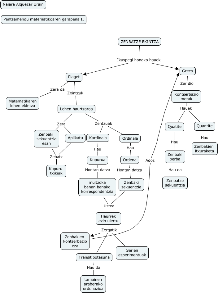 This Concept Map has information related to: Piageten ikuspegia, ZENBATZE EKINTZA Ikuspegi honako hauek Greco, Zenbaki sekuentzia esan Zehatz Kopuru txikiak, Quantite Hau Zenbakien itxuraketa, ZENBATZE EKINTZA Ikuspegi honako hauek Piaget, Piaget Zeintzuk Lehen haurtzaroa, Lehen haurtzaroa Zera Zenbaki sekuentzia esan, Haurrek ezin ulertu Zergatik Transitibotasuna, Kopurua Hontan datza multzoka banan banako korrespondentzia, Greco Zer dio Kontserbazio motak, Piaget Zera da Matematikaren lehen ekintza