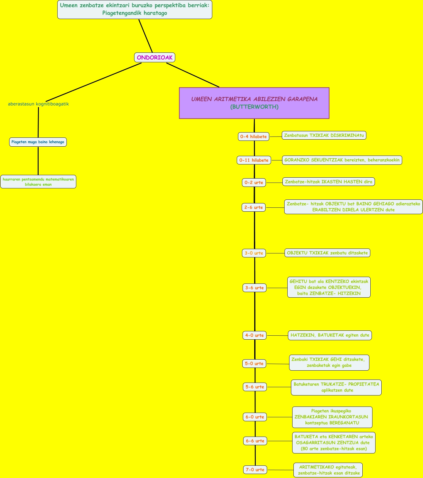 Este mapa conceptual tiene información relacionada a: 4. kontzeptu mapa, txomin, magis 3, ondorioak, 2-6 urte ???? Zenbatze- hitzak OBJEKTU bat BAINO GEHIAGO adierazteko ERABILTZEN DIRELA ULERTZEN dute, ONDORIOAK UMEEN ARITMETIKA ABILEZIEN GARAPENA (BUTTERWORTH) 0-4 hilabete, ONDORIOAK UMEEN ARITMETIKA ABILEZIEN GARAPENA (BUTTERWORTH) 6-6 urte, 0-4 hilabete ???? Zenbatasun TXIKIAK DISKRIMINAtu, 5-0 urte ???? Zenbaki TXIKIAK GEHI ditzakete, zenbaketak egin gabe, 0-2 urte ???? Zenbatze-hitzak IKASTEN HASTEN dira, 5-6 urte ???? Batuketaren TRUKATZE- PROPIETATEA aplikatzen dute, ONDORIOAK UMEEN ARITMETIKA ABILEZIEN GARAPENA (BUTTERWORTH) 3-0 urte, ONDORIOAK UMEEN ARITMETIKA ABILEZIEN GARAPENA (BUTTERWORTH) 5-6 urte, ONDORIOAK UMEEN ARITMETIKA ABILEZIEN GARAPENA (BUTTERWORTH) 4-0 urte