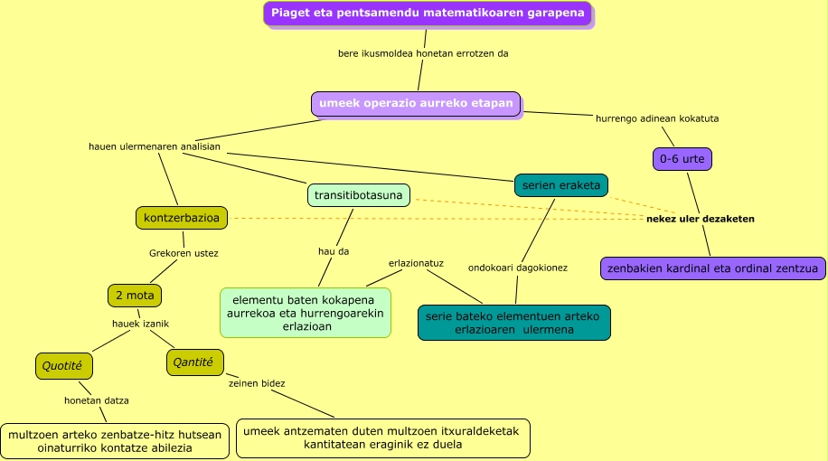 Este Cmap, tiene información relacionada con: 2.Piaget, Greco, transitibotasuna hau da elementu baten kokapena aurrekoa eta hurrengoarekin erlazioan, kontzerbazioa Grekoren ustez 2 mota, 2 mota hauek izanik Quotité, 0-6 urte nekez uler dezaketen serien eraketa, umeek operazio aurreko etapan hauen ulermenaren analisian transitibotasuna, umeek operazio aurreko etapan hurrengo adinean kokatuta 0-6 urte, Piaget eta pentsamendu matematikoaren garapena bere ikusmoldea honetan errotzen da umeek operazio aurreko etapan, 0-6 urte nekez uler dezaketen kontzerbazioa, Quotité honetan datza multzoen arteko zenbatze-hitz hutsean oinaturriko kontatze abilezia, umeek operazio aurreko etapan hauen ulermenaren analisian kontzerbazioa, serien eraketa ondokoari dagokionez serie bateko elementuen arteko erlazioaren ulermena, 2 mota hauek izanik Qantité, 0-6 urte nekez uler dezaketen zenbakien kardinal eta ordinal zentzua, Qantité zeinen bidez umeek antzematen duten multzoen itxuraldeketak kantitatean eraginik ez duela, umeek operazio aurreko etapan hauen ulermenaren analisian serien eraketa, 0-6 urte nekez uler dezaketen transitibotasuna, serie bateko elementuen arteko erlazioaren ulermena erlazionatuz elementu baten kokapena aurrekoa eta hurrengoarekin erlazioan
