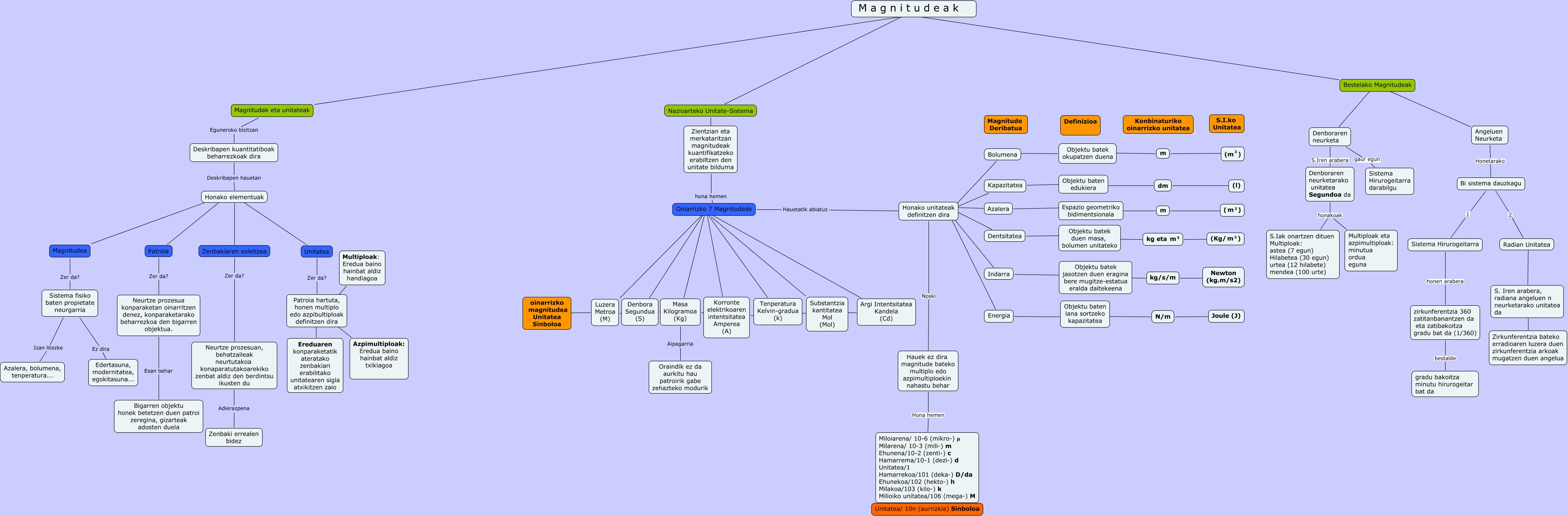 Este mapa conceptual tiene información relacionada a: magnitudeak, Denboraren neurketa gaur egun Sistema Hirurogeitarra darabilgu, Oinarrizko 7 Magnitudeak Sus Substantzia kantitatea Mol (Mol), Oinarrizko 7 Magnitudeak ???? Denbora Segundua (S), Honako unitateak definitzen dira ???? Energia, Bi sistema dauzkagu 1 Sistema Hirurogeitarra, Azalera ???? Espazio geometriko bidimentsionala, Espazio geometriko bidimentsionala ???? m, Energia ???? Objektu baten lana sortzeko kapazitatea, Patroia hartuta, honen multiplo edo azpibultiploak definitzen dira Ereduaren konparaketatik ateratako zenbakiari erabilitako unitatearen sigla atxikitzen zaio, Bestelako Magnitudeak ???? Denboraren neurketa