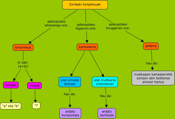 Este Cmap, tiene información relacionada con: Zenbaki konplexuak, polarra hau da: irudikapen kartesiarretik sortzen den bektorea aintzat hartuz, irreala ???? "i", atal irudikaria ordenatuan hau da: ardatz bertikala, binomikoa bi zati: (a+bi) irreala, erreala ???? "a" eta "b", binomikoa bi zati: (a+bi) erreala, atal erreala abzisan hau da: ardatz horizontala, kartesiarra ???? atal irudikaria ordenatuan, kartesiarra ???? atal erreala abzisan, Zenbaki konplexuak adierazteko bigarren era: kartesiarra, Zenbaki konplexuak adierazteko hirugarren era: polarra, Zenbaki konplexuak adierazteko lehenengo era: binomikoa