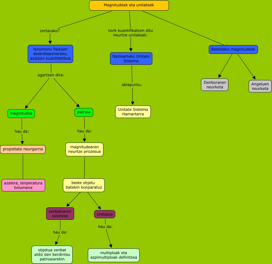 Este Cmap, tiene información relacionada con: Magnitudeak eta unitateak, magnitudearen neurtze prozesua ???? Unitatea, zenbakiaren esleitzea hau da: objetua zenbat aldiz den berdintsu patroaiarekin, magnitudearen neurtze prozesua ???? beste objetu batekin konparatuz, magnitudea hau da: propietate neurgarria, Unitatea hau da: multiploak eta azpimultiploak definitzea, fenomeno fisikoen deskribapenerako, azalpen kuantitatiboa agertzen dira: magnitudea, magnitudearen neurtze prozesua ???? zenbakiaren esleitzea, propietate neurgarria ???? azalera, tenperatura bolumena, Magnitudeak eta unitateak zertarako? fenomeno fisikoen deskribapenerako, azalpen kuantitatiboa, patroia hau da: magnitudearen neurtze prozesua, Nazioarteko Unitate Sistema abiapuntu: Unitate Sistema Hamartarra, Magnitudeak eta unitateak ???? Denboraren neurketa, fenomeno fisikoen deskribapenerako, azalpen kuantitatiboa agertzen dira: patroia, Magnitudeak eta unitateak ???? Bestelako magnitudeak, Magnitudeak eta unitateak ???? Angeluen neurketa, Magnitudeak eta unitateak nork kuantifikatzen ditu neurtze unitateak: Nazioarteko Unitate Sistema