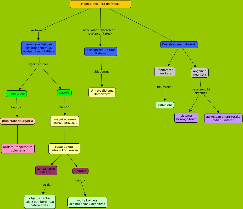 Este Cmap, tiene información relacionada con: Magnitudeak eta unitateak, magnitudearen neurtze prozesua ???? Unitatea, magnitudearen neurtze prozesua ???? beste objetu batekin konparatuz, zenbakiaren esleitzea hau da: objetua zenbat aldiz den berdintsu patroaiarekin, magnitudea hau da: propietate neurgarria, Denboraren neurketa neurtzeko: segundoa, magnitudearen neurtze prozesua ???? zenbakiaren esleitzea, fenomeno fisikoen deskribapenerako, azalpen kuantitatiboa agertzen dira: magnitudea, Unitatea hau da: multiploak eta azpimultiploak definitzea, Magnitudeak eta unitateak zertarako? fenomeno fisikoen deskribapenerako, azalpen kuantitatiboa, propietate neurgarria ???? azalera, tenperatura bolumena, Angeluen neurketa neurtzeko bi sistema: aurrekoan oinarritutako radian unitatea, patroia hau da: magnitudearen neurtze prozesua, Nazioarteko Unitate Sistema abiapuntu: Unitate Sistema Hamartarra, Magnitudeak eta unitateak ???? Denboraren neurketa, fenomeno fisikoen deskribapenerako, azalpen kuantitatiboa agertzen dira: patroia, Magnitudeak eta unitateak ???? Angeluen neurketa, Magnitudeak eta unitateak ???? Bestelako magnitudeak, Magnitudeak eta unitateak nork kuantifikatzen ditu neurtze unitateak: Nazioarteko Unitate Sistema, Angeluen neurketa neurtzeko bi sistema: sistema hirurogeitarra