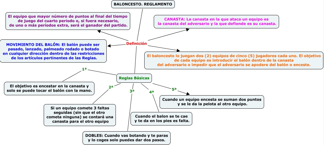 Este Cmap, tiene información relacionada con: Reglas de baloncesto, Reglas Básicas 5ª Cuando un equipo encesta se suman dos puntos y se le da la pelota al otro equipo., BALONCESTO. REGLAMENTO Definición CANASTA: La canasta en la que ataca un equipo es la canasta del adversario y la que defiende es su canasta., Reglas Básicas 4ª Cuando el balon se te cae y te da en los pies es falta., BALONCESTO. REGLAMENTO Definición Reglas Básicas, BALONCESTO. REGLAMENTO Definición El equipo que mayor número de puntos al final del tiempo de juego del cuarto periodo o, si fuera necesario, de uno o más períodos extra, será el ganador del partido., BALONCESTO. REGLAMENTO Definición MOVIMIENTO DEL BALÓN: El balón puede ser pasado, lanzado, palmeado rodado o botado en cualquier dirección dentro de las restricciones de los artículos pertinentes de las Reglas., Reglas Básicas 1ª El objetivo es encestar en la canasta y solo se puede tocar el balón con la mano., Reglas Básicas 2ª Si un equipo comete 3 faltas seguidas (sin que el otro cometa ninguna) se contará una canasta para el otro equipo, Reglas Básicas 3ª DOBLES: Cuando vas botando y te paras y lo coges solo puedes dar dos pasos., BALONCESTO. REGLAMENTO Definición El baloncesto lo juegan dos (2) equipos de cinco (5) jugadores cada uno. El objetivo de cada equipo es introducir el balón dentro de la canasta del adversario e impedir que el adversario se apodere del balón o enceste.
