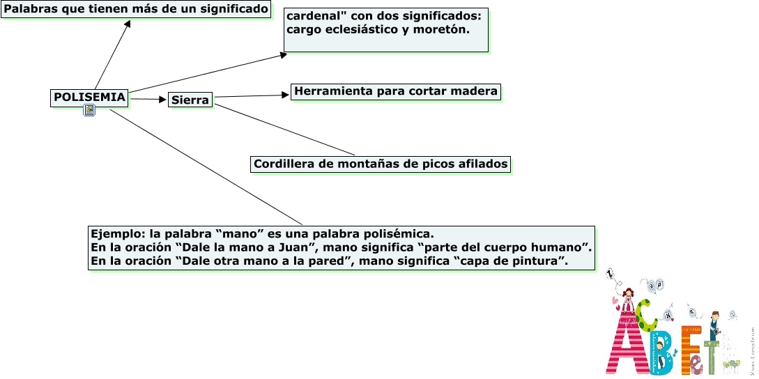 Este Cmap, tiene información relacionada con: POLISEMIA, POLISEMIA ???? Palabras que tienen más de un significado, Sierra ???? Cordillera de montañas de picos afilados, POLISEMIA ???? Sierra, Sierra ???? Herramienta para cortar madera, POLISEMIA ???? cardenal" con dos significados: cargo eclesiástico y moretón., POLISEMIA ???? Ejemplo: la palabra “mano” es una palabra polisémica. En la oración “Dale la mano a Juan”, mano significa “parte del cuerpo humano”. En la oración “Dale otra mano a la pared”, mano significa “capa de pintura”.