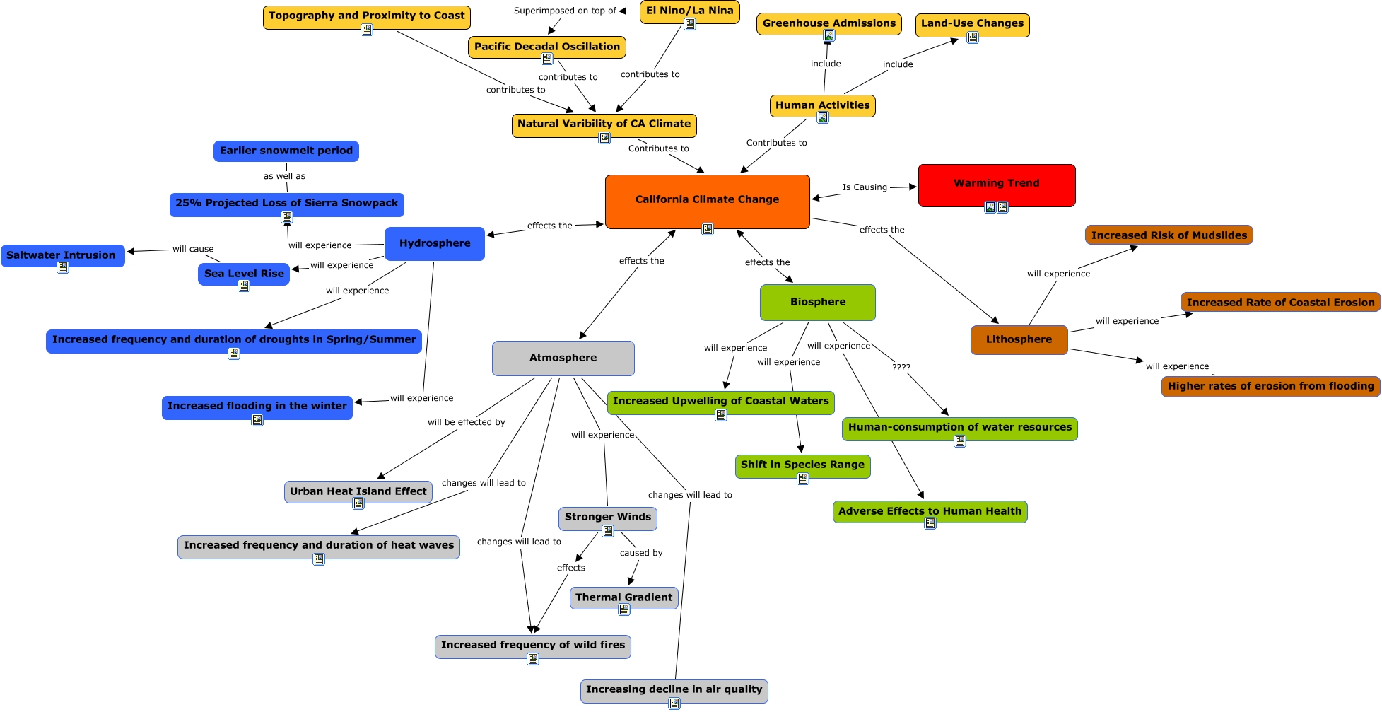This Concept Map, created with IHMC CmapTools, has information related to: ca_climate_change_lw, Biosphere will experience Adverse Effects to Human Health, Human Activities include Greenhouse Admissions, Hydrosphere will experience Sea Level Rise, 25% Projected Loss of Sierra Snowpack as well as Earlier snowmelt period, Atmosphere changes will lead to Increasing decline in air quality, Sea Level Rise will cause Saltwater Intrusion, California Climate Change effects the Lithosphere, Hydrosphere will experience 25% Projected Loss of Sierra Snowpack, Lithosphere will experience Higher rates of erosion from flooding, Lithosphere will experience Increased Risk of Mudslides, Stronger Winds caused by Thermal Gradient, Atmosphere will be effected by Urban Heat Island Effect, Lithosphere will experience Increased Rate of Coastal Erosion, Atmosphere changes will lead to Increased frequency and duration of heat waves, Atmosphere changes will lead to Increased frequency of wild fires, Hydrosphere will experience Increased frequency and duration of droughts in Spring/Summer, El Nino/La Nina Superimposed on top of Pacific Decadal Oscillation, Human Activities include Land-Use Changes, Atmosphere will experience Stronger Winds, Biosphere will experience Increased Upwelling of Coastal Waters