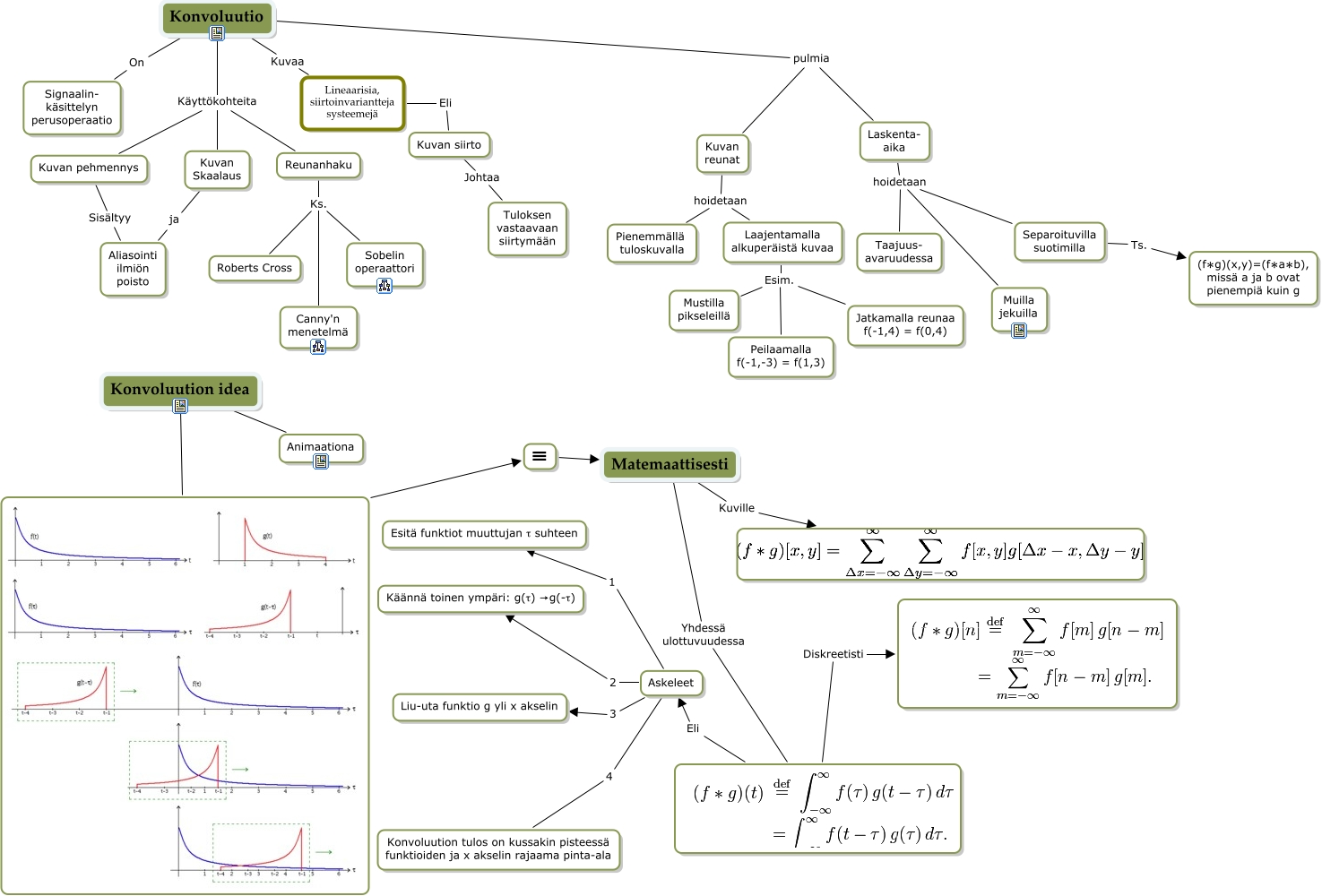 This Concept Map, created with IHMC CmapTools, has information related to: Konvoluutio, Askeleet 4 Konvoluution tulos on kussakin pisteessä funktioiden ja x akselin rajaama pinta-ala, Askeleet 2 Käännä toinen ympäri: g(τ) →g(-τ), Konvoluutio pulmia Laskenta- aika, Kuvan pehmennys Sisältyy Aliasointi ilmiön poisto, Konvoluutio Käyttökohteita Kuvan Skaalaus, Laskenta- aika hoidetaan Taajuus- avaruudessa, Kuvan reunat hoidetaan Pienemmällä tuloskuvalla, Askeleet 3 Liu-uta funktio g yli x akselin, Diskreetisti, Reunanhaku Ks. Sobelin operaattori, Konvoluution idea, Kuvan Skaalaus ja Aliasointi ilmiön poisto, ≡ Matemaattisesti, Laskenta- aika hoidetaan Muilla jekuilla, Separoituvilla suotimilla Ts. (f∗g)(x,y)=(f∗a∗b), missä a ja b ovat pienempiä kuin g, Matemaattisesti Yhdessä ulottuvuudessa, Kuvan reunat hoidetaan Laajentamalla alkuperäistä kuvaa, Konvoluutio Käyttökohteita Kuvan pehmennys, Kuvan siirto Johtaa Tuloksen vastaavaan siirtymään, Reunanhaku Ks. Canny'n menetelmä