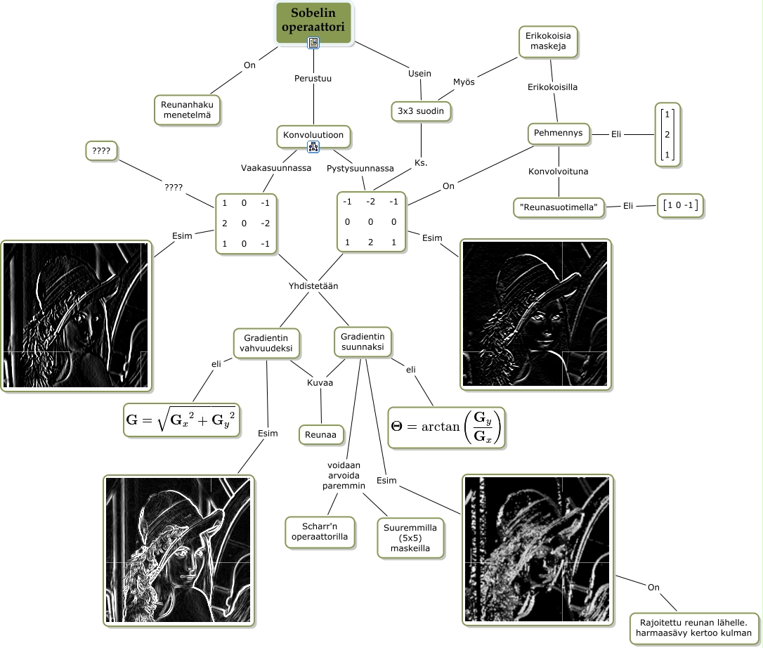 This Concept Map, created with IHMC CmapTools, has information related to: sobelin operaattori, Sobelin operaattori On Reunanhaku menetelmä, Gradientin suunnaksi voidaan arvoida paremmin Suuremmilla (5x5) maskeilla, <math xmlns="http://www.w3.org/1998/Math/MathML"> <mrow> <mtable> <mtr> <mtd> <mtext> -1 </mtext> </mtd> <mtd> <mtext> -2 </mtext> </mtd> <mtd> <mtext> -1 </mtext> </mtd> </mtr> <mtr> <mtd> <mtext> 0 </mtext> </mtd> <mtd> <mtext> 0 </mtext> </mtd> <mtd> <mtext> 0 </mtext> </mtd> </mtr> <mtr> <mtd> <mtext> 1 </mtext> </mtd> <mtd> <mtext> 2 </mtext> </mtd> <mtd> <mtext> 1 </mtext> </mtd> </mtr> </mtable> </mrow> </math> Esim, Gradientin vahvuudeksi Kuvaa Reunaa, Gradientin suunnaksi Kuvaa Reunaa, <math xmlns="http://www.w3.org/1998/Math/MathML"> <mrow> <mtable> <mtr> <mtd> <mtext> -1 </mtext> </mtd> <mtd> <mtext> -2 </mtext> </mtd> <mtd> <mtext> -1 </mtext> </mtd> </mtr> <mtr> <mtd> <mtext> 0 </mtext> </mtd> <mtd> <mtext> 0 </mtext> </mtd> <mtd> <mtext> 0 </mtext> </mtd> </mtr> <mtr> <mtd> <mtext> 1 </mtext> </mtd> <mtd> <mtext> 2 </mtext> </mtd> <mtd> <mtext> 1 </mtext> </mtd> </mtr> </mtable> </mrow> </math> On Pehmennys, "Reunasuotimella" Eli <math xmlns="http://www.w3.org/1998/Math/MathML"> <mrow> <mfenced open="[" close="]"> <mtext> 1 0 -1 </mtext> </mfenced> </mrow> </math>, 3x3 suodin Ks. <math xmlns="http://www.w3.org/1998/Math/MathML"> <mrow> <mtable> <mtr> <mtd> <mtext> -1 </mtext> </mtd> <mtd> <mtext> -2 </mtext> </mtd> <mtd> <mtext> -1 </mtext> </mtd> </mtr> <mtr> <mtd> <mtext> 0 </mtext> </mtd> <mtd> <mtext> 0 </mtext> </mtd> <mtd> <mtext> 0 </mtext> </mtd> </mtr> <mtr> <mtd> <mtext> 1 </mtext> </mtd> <mtd> <mtext> 2 </mtext> </mtd> <mtd> <mtext> 1 </mtext> </mtd> </mtr> </mtable> </mrow> </math>, <math xmlns="http://www.w3.org/1998/Math/MathML"> <mrow> <mtable> <mtr> <mtd> <mtext> 1 </mtext> </mtd> <mtd> <mtext> 0 </mtext> </mtd> <mtd> <mtext> -1 </mtext> </mtd> </mtr> <mtr> <mtd> <mtext> 2 </mtext> </mtd> <mtd> <mtext> 0 </mtext> </mtd> <mtd> <mtext> -2 </mtext> </mtd> </mtr> <mtr> <mtd> <mtext> 1 </mtext> </mtd> <mtd> <mtext> 0 </mtext> </mtd> <mtd> <mtext> -1 </mtext> </mtd> </mtr> </mtable> </mrow> </math> Yhdistetään Gradientin vahvuudeksi, Konvoluutioon Pystysuunnassa <math xmlns="http://www.w3.org/1998/Math/MathML"> <mrow> <mtable> <mtr> <mtd> <mtext> -1 </mtext> </mtd> <mtd> <mtext> -2 </mtext> </mtd> <mtd> <mtext> -1 </mtext> </mtd> </mtr> <mtr> <mtd> <mtext> 0 </mtext> </mtd> <mtd> <mtext> 0 </mtext> </mtd> <mtd> <mtext> 0 </mtext> </mtd> </mtr> <mtr> <mtd> <mtext> 1 </mtext> </mtd> <mtd> <mtext> 2 </mtext> </mtd> <mtd> <mtext> 1 </mtext> </mtd> </mtr> </mtable> </mrow> </math>, Gradientin vahvuudeksi eli, Sobelin operaattori Usein 3x3 suodin, Gradientin suunnaksi eli, <math xmlns="http://www.w3.org/1998/Math/MathML"> <mrow> <mtable> <mtr> <mtd> <mtext> 1 </mtext> </mtd> <mtd> <mtext> 0 </mtext> </mtd> <mtd> <mtext> -1 </mtext> </mtd> </mtr> <mtr> <mtd> <mtext> 2 </mtext> </mtd> <mtd> <mtext> 0 </mtext> </mtd> <mtd> <mtext> -2 </mtext> </mtd> </mtr> <mtr> <mtd> <mtext> 1 </mtext> </mtd> <mtd> <mtext> 0 </mtext> </mtd> <mtd> <mtext> -1 </mtext> </mtd> </mtr> </mtable> </mrow> </math> Yhdistetään <math xmlns="http://www.w3.org/1998/Math/MathML"> <mrow> <mtable> <mtr> <mtd> <mtext> -1 </mtext> </mtd> <mtd> <mtext> -2 </mtext> </mtd> <mtd> <mtext> -1 </mtext> </mtd> </mtr> <mtr> <mtd> <mtext> 0 </mtext> </mtd> <mtd> <mtext> 0 </mtext> </mtd> <mtd> <mtext> 0 </mtext> </mtd> </mtr> <mtr> <mtd> <mtext> 1 </mtext> </mtd> <mtd> <mtext> 2 </mtext> </mtd> <mtd> <mtext> 1 </mtext> </mtd> </mtr> </mtable> </mrow> </math>, Erikokoisia maskeja Erikokoisilla Pehmennys, Pehmennys Konvolvoituna "Reunasuotimella", Sobelin operaattori Perustuu Konvoluutioon, 3x3 suodin Myös Erikokoisia maskeja, <math xmlns="http://www.w3.org/1998/Math/MathML"> <mrow> <mtable> <mtr> <mtd> <mtext> 1 </mtext> </mtd> <mtd> <mtext> 0 </mtext> </mtd> <mtd> <mtext> -1 </mtext> </mtd> </mtr> <mtr> <mtd> <mtext> 2 </mtext> </mtd> <mtd> <mtext> 0 </mtext> </mtd> <mtd> <mtext> -2 </mtext> </mtd> </mtr> <mtr> <mtd> <mtext> 1 </mtext> </mtd> <mtd> <mtext> 0 </mtext> </mtd> <mtd> <mtext> -1 </mtext> </mtd> </mtr> </mtable> </mrow> </math> Esim, Pehmennys Eli <math xmlns="http://www.w3.org/1998/Math/MathML"> <mrow> <mfenced open="[" close="]"> <mtable> <mtr> <mtd> <mtext> 1 </mtext> </mtd> </mtr> <mtr> <mtd> <mtext> 2 </mtext> </mtd> </mtr> <mtr> <mtd> <mtext> 1 </mtext> </mtd> </mtr> </mtable> </mfenced> </mrow> </math>