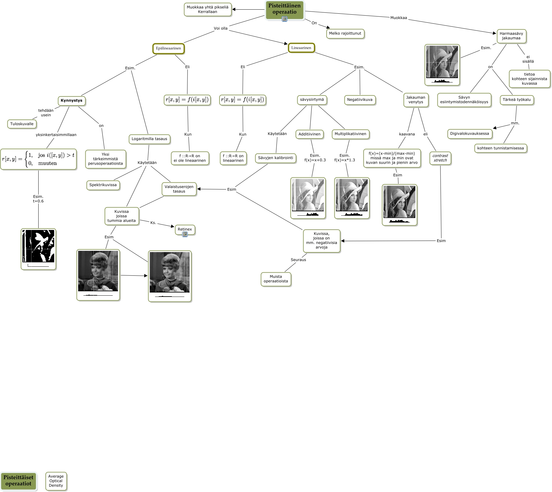 This Concept Map, created with IHMC CmapTools, has information related to: pisteittäiset operaatiot, Sävyjen kalibrointi Esim Valaistuserojen tasaus,, Harmaasävy jakaumaa on Sävyn esiintymistodennäköisyys, Multiplikatiivinen Esim. f(x)=x*1.3, Pisteittäinen operaatio Muokkaa Harmaasävy jakaumaa, sävysiirtymä Käytetään Sävyjen kalibrointi, Pisteittäinen operaatio On Melko rajoittunut, Sävyjen kalibrointi Esim Kuvissa, joissa on mm. negatiivisia arvoja, sävysiirtymä Additiivinen, Valaistuserojen tasaus Kuvissa joissa tummia alueita, Kynnystys on Yksi tärkeimmistä perusoperaatioista, Jakauman venytys eli contrast stretch, Jakauman venytys kaavana f(x)=(x-min)/(max-min) missä max ja min ovat kuvan suurin ja pienin arvo, Pisteittäinen operaatio Voi olla Epälineaarinen, f(x)=(x-min)/(max-min) missä max ja min ovat kuvan suurin ja pienin arvo Esim, Lineaarinen Esim. Jakauman venytys, Lineaarinen Eli, Kun f ::R→R on lineaarinen, Kuvissa joissa tummia alueita Ks. Retinex, Kuvissa joissa tummia alueita Esim
