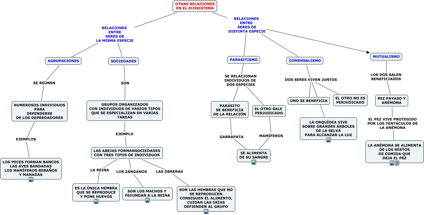 Este Cmap, tiene información relacionada con: otras relaciones en el ecosistema, OTRAS RELACIONES EN EL ECOSISTEMA RELACIONES ENTRE SERES DE DISTINTA ESPECIE PARASITISMO, PARÁSITO SE BENEFICIA DE LA RELACIÓN GARRAPATA SE ALIMENTA DE SU SANGRE, OTRAS RELACIONES EN EL ECOSISTEMA RELACIONES ENTRE SERES DE LA MISMA ESPECIE SOCIEDADES, PARASITISMO SE RELACIONAN INDIVIDUOS DE DOS ESPECIES PARÁSITO SE BENEFICIA DE LA RELACIÓN, SOCIEDADES SON GRUPOS ORGANIZADOS CON INDIVIDUOS DE VARIOS TIPOS QUE SE ESPECIALIZAN EN VARIAS TAREAS, EL OTRO SALE PERJUDICADO MAMÍFEROS SE ALIMENTA DE SU SANGRE, NUMEROSOS INDIVIDUOS PARA DEFENDERSE DE LOS DEPREDADORES EJEMPLOS LOS PECES FORMAN BANCOS LAS AVES BANDADAS LOS MAMÍFEROS REBAÑOS Y MANADAS, PEZ PAYASO Y ANÉMONA EL PEZ VIVE PROTEGIDO POR LOS TENTÁCULOS DE LA ANÉMONA LA ANÉMONA SE ALIMENTA DE LOS RESTOS DE COMIDA QUE DEJA EL PEZ, PARASITISMO SE RELACIONAN INDIVIDUOS DE DOS ESPECIES EL OTRO SALE PERJUDICADO, AGRUPACIONES SE REÚNEN NUMEROSOS INDIVIDUOS PARA DEFENDERSE DE LOS DEPREDADORES, OTRAS RELACIONES EN EL ECOSISTEMA RELACIONES ENTRE SERES DE DISTINTA ESPECIE COMENSALISMO, OTRAS RELACIONES EN EL ECOSISTEMA RELACIONES ENTRE SERES DE DISTINTA ESPECIE MUTUALISMO, LAS ABEJAS FORMANSOCIEDADES CON TRES TIPOS DE INDIVIDUOS LA REINA ES LA ÚNICA HEMBRA QUE SE REPRODUCE Y PONE HUEVOS, COMENSALISMO DOS SERES VIVEN JUNTOS LA ORQUÍDEA VIVE SOBRE GRANDES ÁRBOLES DE LA SELVA PARA ALCANZAR LA LUZ, COMENSALISMO DOS SERES VIVEN JUNTOS UNO SE BENEFICIA, LAS ABEJAS FORMANSOCIEDADES CON TRES TIPOS DE INDIVIDUOS LAS OBRERAS SON LAS HEMBRAS QUE NO SE REPRODUCEN. CONSIGUEN EL ALIMENTO, CUIDAN LAS CRÍAS DEFIENDEN AL GRUPO, OTRAS RELACIONES EN EL ECOSISTEMA RELACIONES ENTRE SERES DE LA MISMA ESPECIE AGRUPACIONES, GRUPOS ORGANIZADOS CON INDIVIDUOS DE VARIOS TIPOS QUE SE ESPECIALIZAN EN VARIAS TAREAS EJEMPLO LAS ABEJAS FORMANSOCIEDADES CON TRES TIPOS DE INDIVIDUOS, MUTUALISMO LOS DOS SALEN BENEFICIADOS PEZ PAYASO Y ANÉMONA, LAS ABEJAS FORMANSOCIEDADES CON TRES TIPOS DE INDIVIDUOS LOS ZÁNGANOS SON LOS MACHOS Y FECUNDAN A LA REINA