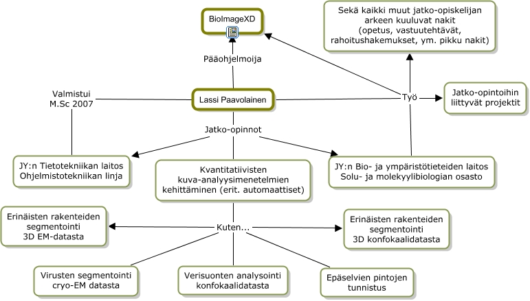 Tämä IHMC CmapToolsilla luotu käsitekartta sisältää tietoa, joka liittyy aiheeseen: Lassi, Kvantitatiivisten kuva-analyysimenetelmien kehittäminen (erit. automaattiset) Kuten... Verisuonten analysointi konfokaalidatasta, Lassi Paavolainen Jatko-opinnot JY:n Bio- ja ympäristötieteiden laitos Solu- ja molekyylibiologian osasto, Lassi Paavolainen Pääohjelmoija BioImageXD, Kvantitatiivisten kuva-analyysimenetelmien kehittäminen (erit. automaattiset) Kuten... Epäselvien pintojen tunnistus, Lassi Paavolainen Työ Sekä kaikki muut jatko-opiskelijan arkeen kuuluvat nakit (opetus, vastuutehtävät, rahoitushakemukset, ym. pikku nakit), Lassi Paavolainen Jatko-opinnot JY:n Tietotekniikan laitos Ohjelmistotekniikan linja, Lassi Paavolainen Työ BioImageXD, Kvantitatiivisten kuva-analyysimenetelmien kehittäminen (erit. automaattiset) Kuten... Erinäisten rakenteiden segmentointi 3D konfokaalidatasta, Kvantitatiivisten kuva-analyysimenetelmien kehittäminen (erit. automaattiset) Kuten... Erinäisten rakenteiden segmentointi 3D EM-datasta, Lassi Paavolainen Valmistui M.Sc 2007 JY:n Tietotekniikan laitos Ohjelmistotekniikan linja, Lassi Paavolainen Jatko-opinnot Kvantitatiivisten kuva-analyysimenetelmien kehittäminen (erit. automaattiset), Lassi Paavolainen Työ Jatko-opintoihin liittyvät projektit, Kvantitatiivisten kuva-analyysimenetelmien kehittäminen (erit. automaattiset) Kuten... Virusten segmentointi cryo-EM datasta, Lassi Paavolainen Työ JY:n Bio- ja ympäristötieteiden laitos Solu- ja molekyylibiologian osasto