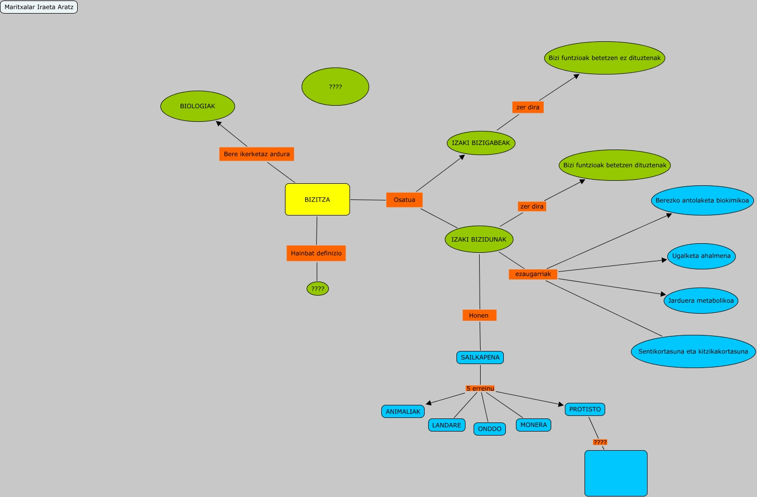 Este Cmap, tiene información relacionada con: Maritxalar Iraeta Aratz, IZAKI BIZIDUNAK ezaugarriak Berezko antolaketa biokimikoa, SAILKAPENA 5 erreinu ONDDO, SAILKAPENA 5 erreinu MONERA, SAILKAPENA 5 erreinu ANIMALIAK, IZAKI BIZIDUNAK ezaugarriak Sentikortasuna eta kitzikakortasuna, BIZITZA Bere ikerketaz ardura BIOLOGIAK, IZAKI BIZIGABEAK zer dira Bizi funtzioak betetzen ez dituztenak, IZAKI BIZIDUNAK Honen SAILKAPENA, IZAKI BIZIDUNAK ezaugarriak Jarduera metabolikoa, IZAKI BIZIDUNAK ezaugarriak Ugalketa ahalmena, BIZITZA Osatua IZAKI BIZIDUNAK, BIZITZA Osatua IZAKI BIZIGABEAK, SAILKAPENA 5 erreinu PROTISTO, BIZITZA Hainbat definizio ????, PROTISTO ????, SAILKAPENA 5 erreinu LANDARE, IZAKI BIZIDUNAK zer dira Bizi funtzioak betetzen dituztenak