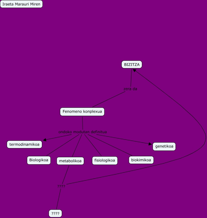 Este Cmap, tiene información relacionada con: iraeta marauri miren, metabolikoa ???? ????, Fenomeno konplexua ondoko modutan definitua metabolikoa, Fenomeno konplexua ondoko modutan definitua Biologikoa, metabolikoa ???? BIZITZA, Fenomeno konplexua ondoko modutan definitua termodinamikoa, Fenomeno konplexua ondoko modutan definitua genetikoa, Fenomeno konplexua ondoko modutan definitua biokimikoa, Fenomeno konplexua ondoko modutan definitua fisiologikoa, BIZITZA zera da Fenomeno konplexua