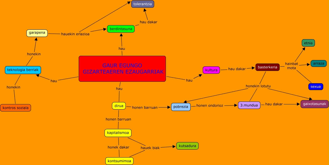 Este Cmap, tiene información relacionada con: gizarte ezaugarriak, basterkeria honekin lotutu pobrezia, GAUR EGUNGO GIZARTEAEREN EZAUGARRIAK hau kultura, garapena hauekin erlazioa berdintasuna, GAUR EGUNGO GIZARTEAEREN EZAUGARRIAK hau dirua, garapena hauekin erlazioa tolerantzia, basterkeria hainbat mota arraza, basterkeria hainbat mota etnia, dirua honen barruan pobrezia, pobrezia honen ondorioz 3.mundua, berdintasuna hau dakar tolerantzia, basterkeria honekin lotutu 3.mundua, GAUR EGUNGO GIZARTEAEREN EZAUGARRIAK hau teknologia berriak, dirua honen barruan kapitalismoa, kapitalismoa hauek biak kutsadura, 3.mundua hau dakar gaixotasunak, kontsumimoa hauek biak kutsadura, kultura hau dakar basterkeria, GAUR EGUNGO GIZARTEAEREN EZAUGARRIAK hau berdintasuna, basterkeria hainbat mota sexua, kapitalismoa honek dakar kontsumimoa