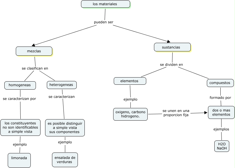 Este Cmap, tiene información relacionada con: mapa conceptual quimica, sustancias se dividen en elementos, heterogeneas se caracterizan es posible distinguir a simple vista sus componentes, elementos ejemplo oxigeno, carbono hidrogeno., homogeneas se caracterizan por los constituyentes no son identificables a simple vista, oxigeno, carbono hidrogeno. se unen en una proporcion fija dos o mas elementos, sustancias se dividen en compuestos, los materiales pueden ser mezclas, mezclas se clasifican en homogeneas, dos o mas elementos ejemplos H2O NaOH, los constituyentes no son identificables a simple vista ejemplo limonada, compuestos formado por dos o mas elementos, los materiales pueden ser sustancias, es posible distinguir a simple vista sus componentes ejemplo ensalada de verduras, mezclas se clasifican en heterogeneas