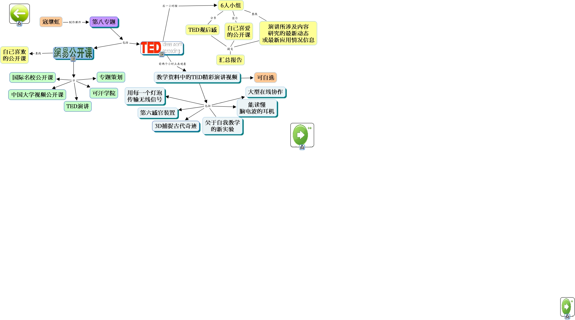 此概念图以 IHMC CmapTools 创建, 内含信息有关于: 第八专题 网易公开课 TED演讲, 教学资料中的TED精彩演讲视频 包括 关于自我教学 的新实验, 查找 自己喜欢 的公开课, 教学资料中的TED精彩演讲视频 包括 3D捕捉古代奇迹, 第八专题 包括, 自己喜爱 的公开课 提交 汇总报告, 教学资料中的TED精彩演讲视频 包括 大型在线协作, 分 TED演讲, 教学资料中的TED精彩演讲视频 包括 第六感官装置, 演讲所涉及内容 研究的最新动态 或最新应用情况信息 提交 汇总报告, 教学资料中的TED精彩演讲视频 包括 用每一个灯泡 传输无线信号, 教学资料中的TED精彩演讲视频 ???? 可自选, 分 国际名校公开课, 后一小时按 6人小组, 第八专题 包括, 教学资料中的TED精彩演讲视频 包括 能读懂 脑电波的耳机, 6人小组 查找 演讲所涉及内容 研究的最新动态 或最新应用情况信息, 分 中国大学视频公开课, 分 可汗学院, 寇继虹 制作课件 第八专题, 分 专题策划