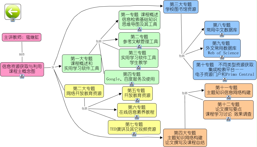 此概念图以 IHMC CmapTools 创建, 内含信息有关于: 信息资源获取与利用课程主概念图2014, 信息资源获取与利用 课程主概念图 分 第三大专题 学校图书馆资源, 第一大专题 课程概述和 实用学习软件工具 包括 第二专题 参考文献管理工具, 第一大专题 课程概述和 实用学习软件工具 包括 第四专题 Google、百度服务及使用, 第二大专题 网络开放教育资源 包括 第六专题 在线信息素养教程, 信息资源获取与利用 课程主概念图 分 第二大专题 网络开放教育资源, 第三大专题 学校图书馆资源 包括 第十专题 不同类型资源获取 集成检索平台—— 电子资源门户和Primo Central, 第四大专题 主题知识网络构建 论文撰写及课程总结 包括 第十一专题 主题知识信息网络构建, 第一大专题 课程概述和 实用学习软件工具 包括 第三专题 实用学习软件工具 学生教学, 第二大专题 网络开放教育资源 包括 第五专题 开放教育资源, 第二大专题 网络开放教育资源 包括 第七专题 TED演讲及其它视频资源, 第三大专题 学校图书馆资源 包括 第八专题 常用中文数据库, 第四大专题 主题知识网络构建 论文撰写及课程总结 包括 第十二专题 论文撰写要点 课程学习讨论 效果调查, 信息资源获取与利用 课程主概念图 分 第一大专题 课程概述和 实用学习软件工具, 信息资源获取与利用 课程主概念图 分 第四大专题 主题知识网络构建 论文撰写及课程总结, 第一大专题 课程概述和 实用学习软件工具 包括 第一专题 课程概述 信息检索基础知识 思维导图及其工具, 第三大专题 学校图书馆资源 包括 第九专题 外文常用数据库 Web of Science, 主讲教师:寇继虹 制作 信息资源获取与利用 课程主概念图