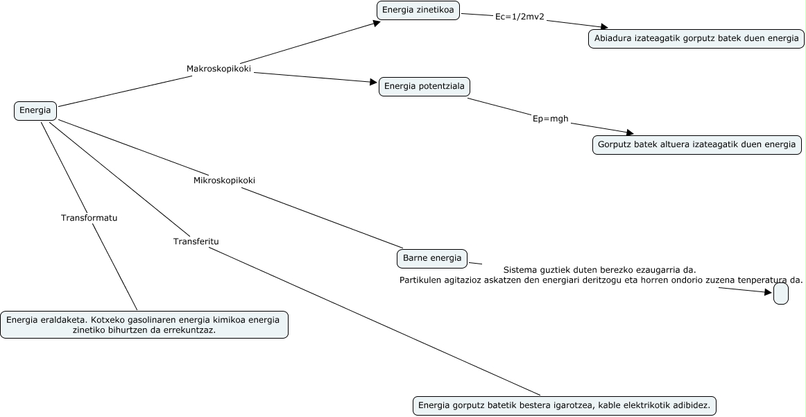 Este Cmap, tiene información relacionada con: hezkuntza149, Barne energia Sistema guztiek duten berezko ezaugarria da. Partikulen agitazioz askatzen den energiari deritzogu eta horren ondorio zuzena tenperatura da., Energia Transformatu Energia eraldaketa. Kotxeko gasolinaren energia kimikoa energia zinetiko bihurtzen da errekuntzaz., Energia potentziala Ep=mgh Gorputz batek altuera izateagatik duen energia, Energia zinetikoa Ec=1/2mv2 Abiadura izateagatik gorputz batek duen energia, Energia Mikroskopikoki Barne energia, Energia Transferitu Energia gorputz batetik bestera igarotzea, kable elektrikotik adibidez., Energia Makroskopikoki Energia potentziala, Energia Makroskopikoki Energia zinetikoa