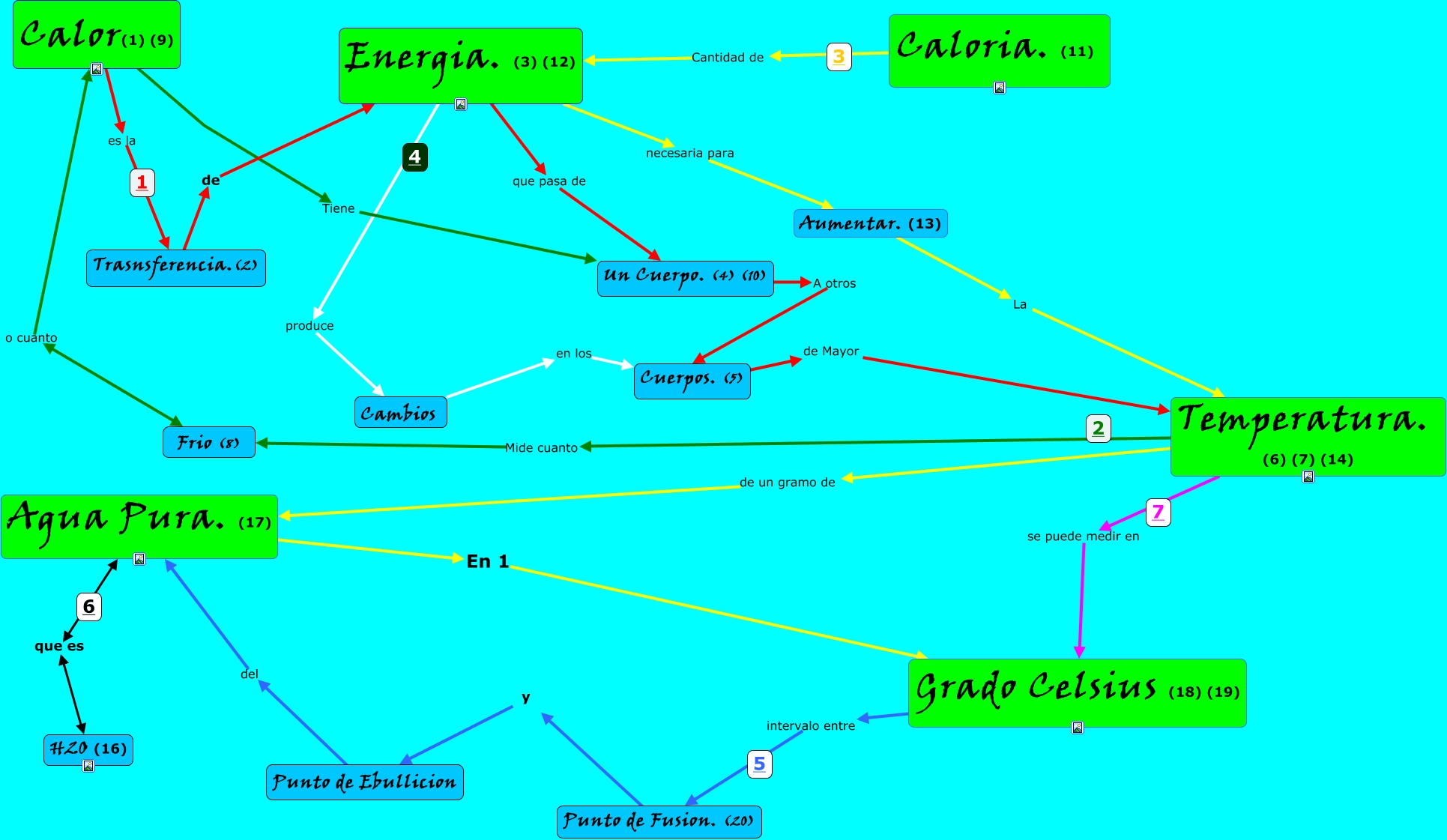 This Concept Map, created with IHMC CmapTools, has information related to: Calor, Energia, Temperatura, Caloria, Punto de Fusion. (20) y Punto de Ebullicion, Energia. (3) (12) necesaria para Aumentar. (13), Trasnsferencia.(2) de Energia. (3) (12), Un Cuerpo. (4) (10) A otros Cuerpos. (5), Temperatura. (6) (7) (14) Mide cuanto Frio (8), Grado Celsius (18) (19) intervalo entre Punto de Fusion. (20), Temperatura. (6) (7) (14) se puede medir en Grado Celsius (18) (19), Frio (8) o cuanto Calor(1) (9), Calor(1) (9) Tiene Un Cuerpo. (4) (10), Energia. (3) (12) produce Cambios, Temperatura. (6) (7) (14) de un gramo de Agua Pura. (17), Aumentar. (13) La Temperatura. (6) (7) (14), Calor(1) (9) es la Trasnsferencia.(2), Caloria. (11) Cantidad de Energia. (3) (12), Cuerpos. (5) de Mayor Temperatura. (6) (7) (14), Energia. (3) (12) que pasa de Un Cuerpo. (4) (10), Agua Pura. (17) que es H2O (16), Punto de Ebullicion del Agua Pura. (17), Agua Pura. (17) En 1 Grado Celsius (18) (19), Cambios en los Cuerpos. (5)