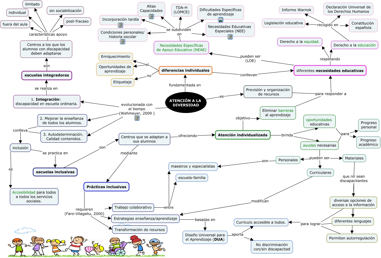 Este Cmap, tiene información relacionada con: BAD_PEC1_Tema1, Derecho a la educación recogido en Declaración Universal de los Derechos Humanos, ayudas necesarias pueden ser Personales, Derecho a la educación recogido en Legislación educativa, diferencias individuales conllevan diferentes necesidades educativas, escuelas inclusivas son Centros que se adaptan a sus alumnos, ATENCIÓN A LA DIVERSIDAD evolucionada con el tiempo (Wehmeyer, 2009 ) 3. Autodeterminación. Calidad contenidos., Prácticas inclusivas requieren (Faro-Vilageliu, 2000) Trabajo colaborativo, diferentes necesidades educativas respetando Derecho a la equidad., Necesidades Específicas de Apoyo Educativo (NEAE) se subdividen en Necesidades Educativas Especiales (NEE), Curriculares modifican Estrategias enseñanza/aprendizaje, Centros a los que los alumnos con discapacidad deben adaptarse características apoyo fuera del aula, Materiales que no sean discapacitantes Permiten autorregulación, ayudas necesarias para Progreso personal, Trabajo colaborativo entre escuela-familia, diferencias individuales sí Enriquecimiento, Previsión y organización de recursos para responder a diferentes necesidades educativas, ayudas necesarias pueden ser Materiales, oportunidades educativas para Progreso personal, diferencias individuales sí Oportunidades de aprendizaje, ATENCIÓN A LA DIVERSIDAD evolucionada con el tiempo (Wehmeyer, 2009 ) 1. Integración: discapacidad en escuela ordinaria.