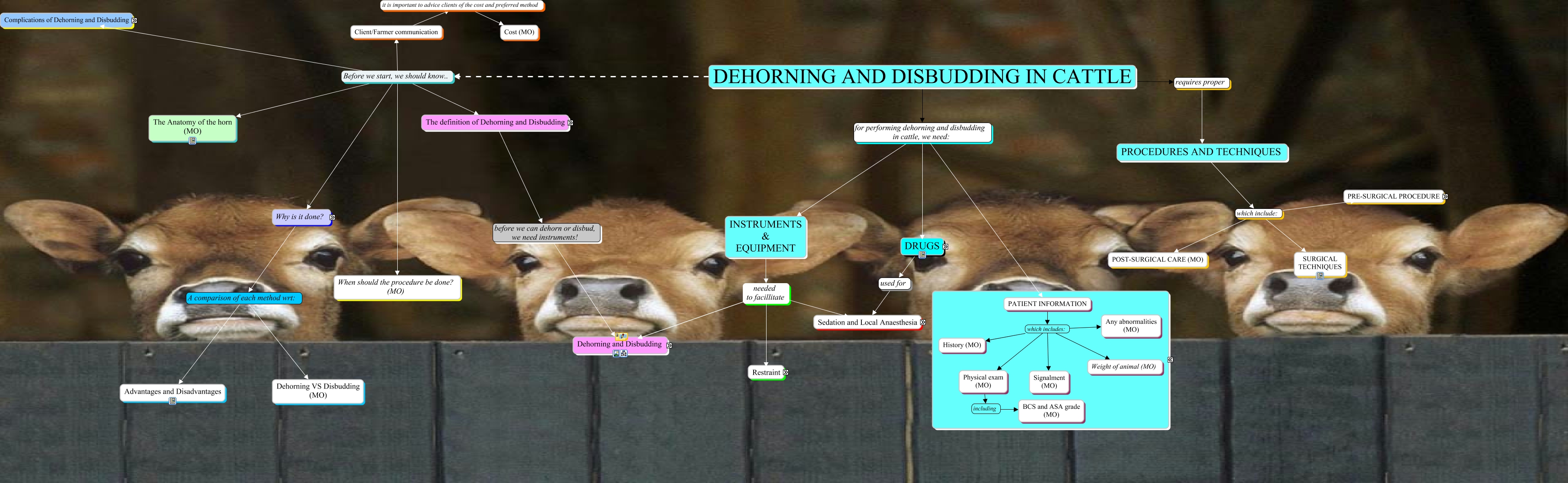 This Concept Map, created with IHMC CmapTools, has information related to: Dehorning and Disbudding in Cattle - calves, Dehorning (MO) is executed with Scoop, Gouge or Barnes type dehorner, PATIENT INFORMATION which includes: Weight of animal (MO), DRUGS which include: ANTI-INFLAMMATORY (MO), Complications associated with the procedure and after care Examples of procedure complications include: Blood loss, PROCEDURES AND TECHNIQUES which include: SURGICAL TECHNIQUES, Physical exam (MO) including BCS and ASA grade (MO), DEHORNING AND DISBUDDING IN CATTLE Before we start, we should know.. Complications associated with the procedure and after care, Client/Farmer communication it is important to advice clients of the cost and preferred method Cost (MO), WHY? include Management practice: to prevent injury to handlers and other animals., WHY? include Less space needed for animals., Restraint Chemical Sedation (ketamine stun) (MO), DRUGS used for Sedation and Local Anaesthesia, Gigli wire instruments which induce bleeding are controlled/minimized by a A haemostat forceps, PRE-SURGICAL PROCEDURE involves: Step 1: Restraint (MO), INSTRUMENTS & EQUIPMENT needed to facillitate Restraint, Keystone dehorner instruments which induce bleeding are controlled/minimized by a A haemostat forceps, DRUGS which include: ANTIBACTERIAL (MO), WHY? include Makes animals easier to handle., Sedation and Local Anaesthesia executed with needles (MO), The definition of Dehorning and Disbudding before we can dehorn or disbud, we need instruments! Dehorning and Disbudding