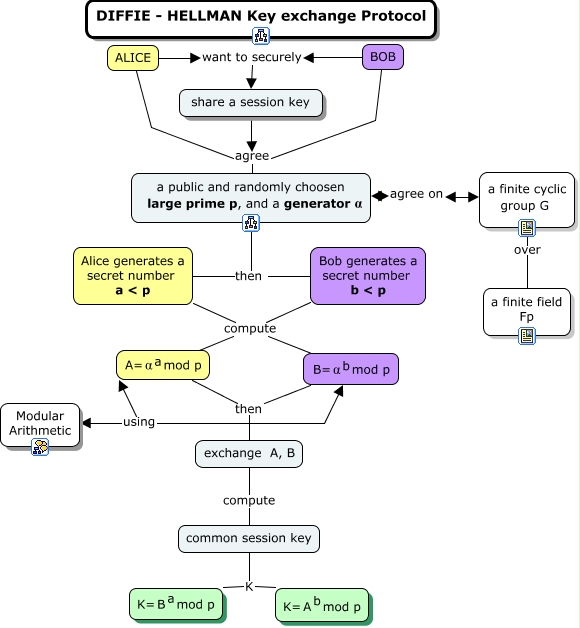 Este Cmap, tiene información relacionada con: Diffie-Hellman Protocol, a public and randomly choosen large prime p, and a generator α then Bob generates a secret number b < p, exchange A, B compute common session key, ALICE want to securely share a session key, Bob generates a secret number b < p compute <math xmlns="http://www.w3.org/1998/Math/MathML"> <mtext> A= </mtext> <mmultiscripts> <mtext> α </mtext> <none/> <mtext> a </mtext> </mmultiscripts> <mtext> mod p </mtext> </math>, Alice generates a secret number a < p compute <math xmlns="http://www.w3.org/1998/Math/MathML"> <mtext> B= </mtext> <mmultiscripts> <mtext> α </mtext> <none/> <mtext> b </mtext> </mmultiscripts> <mtext> mod p </mtext> </math>, BOB agree a public and randomly choosen large prime p, and a generator α, BOB want to securely share a session key, <math xmlns="http://www.w3.org/1998/Math/MathML"> <mtext> A= </mtext> <mmultiscripts> <mtext> α </mtext> <none/> <mtext> a </mtext> </mmultiscripts> <mtext> mod p </mtext> </math> then exchange A, B, a finite cyclic group G over <math xmlns="http://www.w3.org/1998/Math/MathML"> <mtext> a finite field