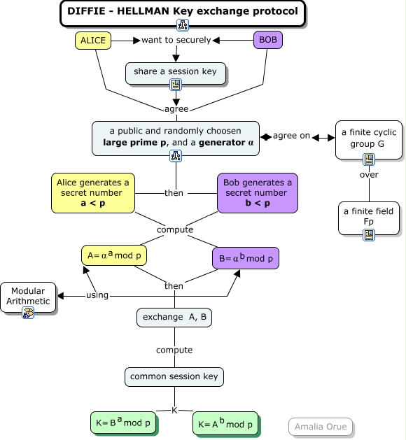 Este Cmap, tiene información relacionada con: Diffie-Hellman Protocol, a public and randomly choosen large prime p, and a generator α then Bob generates a secret number b < p, exchange A, B compute common session key, ALICE want to securely share a session key, Bob generates a secret number b < p compute <math xmlns="http://www.w3.org/1998/Math/MathML"> <mtext> A= </mtext> <mmultiscripts> <mtext> α </mtext> <none/> <mtext> a </mtext> </mmultiscripts> <mtext> mod p </mtext> </math>, Alice generates a secret number a < p compute <math xmlns="http://www.w3.org/1998/Math/MathML"> <mtext> B= </mtext> <mmultiscripts> <mtext> α </mtext> <none/> <mtext> b </mtext> </mmultiscripts> <mtext> mod p </mtext> </math>, BOB agree a public and randomly choosen large prime p, and a generator α, BOB want to securely share a session key, <math xmlns="http://www.w3.org/1998/Math/MathML"> <mtext> A= </mtext> <mmultiscripts> <mtext> α </mtext> <none/> <mtext> a </mtext> </mmultiscripts> <mtext> mod p </mtext> </math> then exchange A, B, a finite cyclic group G over <math xmlns="http://www.w3.org/1998/Math/MathML"> <mtext> a finite field
