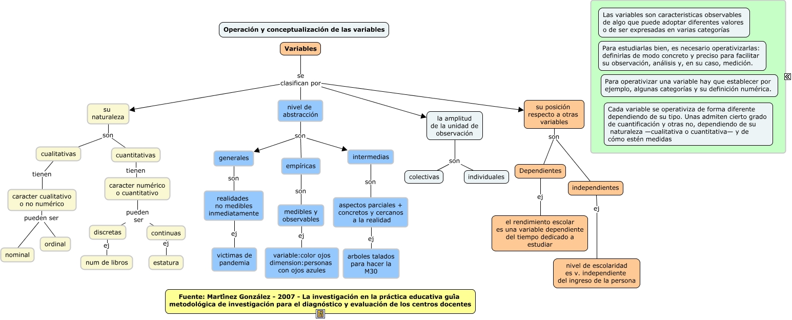 Este Cmap, tiene información relacionada con: Operación y conceptualización de las variables, nivel de abstracción son generales, independientes ej nivel de escolaridad es v. independiente del ingreso de la persona, su naturaleza son cuantitativas, realidades no medibles inmediatamente ej victimas de pandemia, cuantitativas tienen caracter numérico o cuantitativo, su naturaleza son cualitativas, su posición respecto a otras variables son independientes, caracter cualitativo o no numérico pueden ser nominal, caracter numérico o cuantitativo pueden ser continuas, Variables se clasifican por su naturaleza, generales son realidades no medibles inmediatamente, caracter numérico o cuantitativo pueden ser discretas, Variables se clasifican por nivel de abstracción, cualitativas tienen caracter cualitativo o no numérico, intermedias son aspectos parciales + concretos y cercanos a la realidad, discretas ej num de libros, la amplitud de la unidad de observación son individuales, nivel de abstracción son intermedias, su posición respecto a otras variables son Dependientes, continuas ej estatura