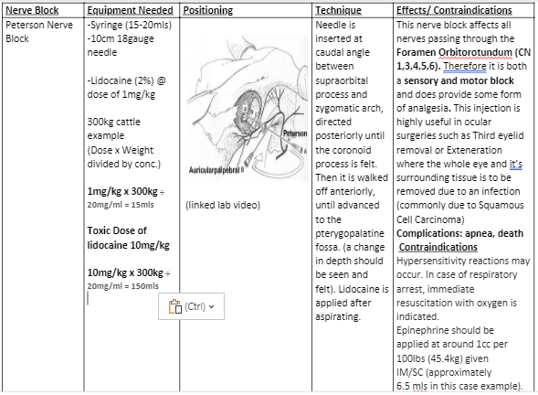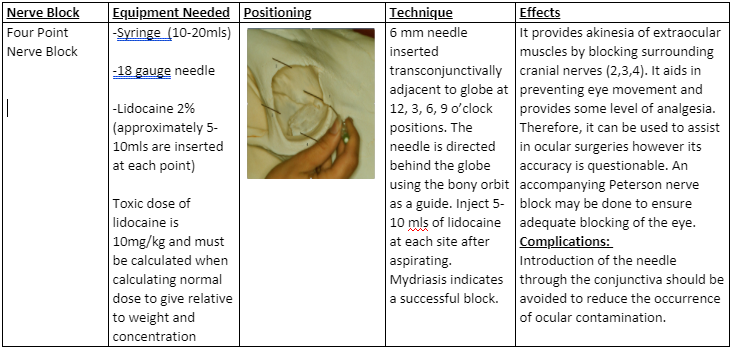This Concept Map, created with IHMC CmapTools, has information related to: Lab 3- Eye Surgeries, Third Eyelid Removal sectioned into Post up care, 2nd Clamp 3rd Clamp, Pre-op care consisting of Drugs, Post-Op Drugs Apply the following daily Matabicheras Fort Dodge Aerosol Used as a healing agent & larvicide repellent. Contains 34 ml/100ml of Suppona and 51 ml/100ml of Vapona, two phosphorous products as well as Gentian Violet, a healing agent that leads to recovery of tissue. The Vapona kills any larvae that may be present by immediate paralysis, while the Sapona, by its residual power, propels and protects against reinfestation., V-Plasty Wedge Resection Pentagonal resection, Removal Surgeries Including Exenteration, Pack orbit for 5 mins. Then ligate any bleeders before closing STEP 8 Palpate remaining orbital tissue and bone for addtional evidence of neoplasia, Removal Surgeries Including Enucleation, The entire contents of the eye, i.e. the vascular coat, lens, retina, viterous etc. are removed. STEP 2 A spherical silcone prosthetic implant is placed within the scleral shell. The outer shell of the eye and the eyelids are left intact., The optic nerve is severed. STEP 5 Following removal of the globe the eyelid margins, the conjunctiva, the third eyelid and its gland are removed., CLOSURE There are two layers that must be closed; 1) SQ tissue: use a 2-0 absorbable suture, simple continuous. 2) Skin: use a 0 non- absorbable suture, interrupted horizontal mattress. Infraorbital Prostesis may be used in closing. See >>, Corrective Surgeries such as Eye-lid Tucking, Nerve Blocks notably 4 point nerve block, Enucleation Indications 1. For the Tx of a painful, blind eye. 2. For the Tx of an inoperable intraoccular neoplasm., Enucleation Indications 1. For the Tx of a painful, blind eye. 2. For the Tx of an inoperable intraoccular neoplasm., Closure of the orbital is acheived in 3 layers. The 1st layer apposing the tissue close to the orbital rim is commenced loosely. STEP 3 Once the suture has progresed 1/3 of distance to be closed, insert implant into orbit after sterlising it and rinsing in sterile water., Third Eyelid Removal sectioned into Procedure, Perform a lateral canthotomy to allow better access. STEP 2 Grasp conjunctiva & incise for 360 degrees around the globe approx. 5 mm from the limbus., Third eyelid flap How? Prep: Clip the skin around the eye and perform the regular scrubs Procedure: The third eyelid can be sutured ti the dorso-lateral conjunctival fornix or thr dorso-lateral bulbar conjunctiva. A detailed procedure is shown in the linked video The flap can be left on for 7-14 days, Proceedure STEP 1 The entire contents of the eye, i.e. the vascular coat, lens, retina, viterous etc. are removed.