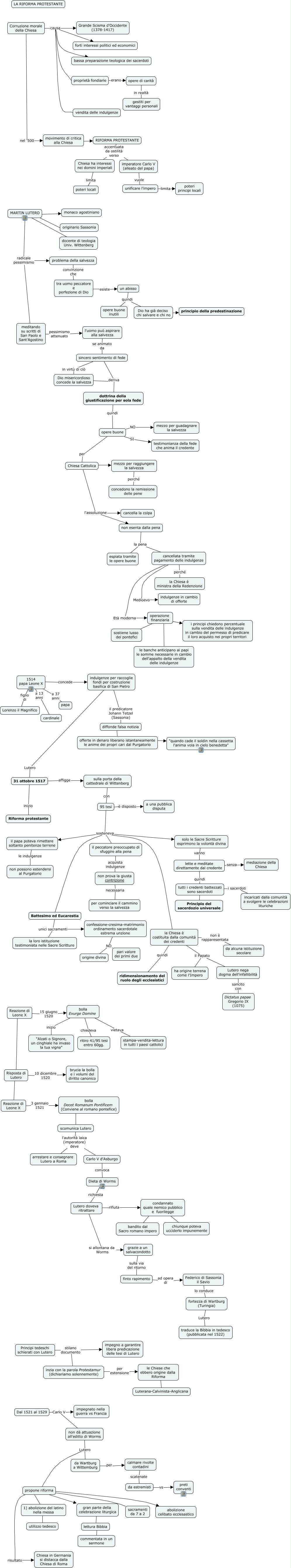Questa Cmap, creata con IHMC CmapTools, contiene informazioni relative a: Riforma protestante, 95 tesi è disposto a una pubblica disputa, 95 tesi sosteneva la Chiesa è costituita dalla comunità dei credenti, Battesimo ed Eucarestia unici sacramenti confessione-cresima-matrimonio ordinamento sacerdotale estrema unzione, da Wartburg a Wittemburg per calmare rivolte contadini, opere di carità in realtà gestiti per vantaggi personali, offerte in denaro liberano istantaneamente le anime dei propri cari dal Purgatorio ???? "quando cade il soldin nella cassetta l'anima vola in cielo benedetta", proprietà fondiarie erano opere di carità, MARTIN LUTERO ???? originario Sassonia, propone riforma ???? gran parte della celebrazione liturgica, sulla porta della cattedrale di Wittenberg con 95 tesi, MARTIN LUTERO ???? docente di teologia Univ. Wittenberg, lette e meditate direttamente dal credente quindi tutti i credenti battezzati sono sacerdoti, Risposta di Lutero 10 dicembre 1520 brucia la bolla e i volumi del diritto canonico, lette e meditate direttamente dal credente senza mediazione della Chiesa, non esenta dalla pena la pena espiata tramite le opere buone, RIFORMA PROTESTANTE accentuata da ostilità verso Chiesa ha interessi nei domini imperiali, 1514 papa Leone X a 13 anni cardinale, bolla Decet Romanum Pontificem (Conviene al romano pontefice) ???? scomunica Lutero, tutti i credenti battezzati sono sacerdoti i sacerdoti incaricati dalla comunità a svolgere le celebrazioni lituriche, scomunica Lutero l'autorità laica (imperatore) deve Carlo V d'Asburgo