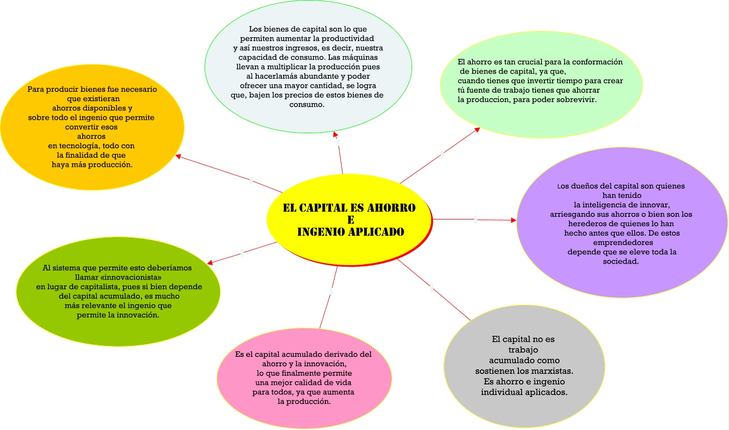 Este Cmap, tiene información relacionada con: AUTOMOTRIZ NOCHE, El capital es ahorro e ingenio aplicado Para producir bienes fue necesario que existieran ahorros disponibles y sobre todo el ingenio que permite convertir esos ahorros en tecnología, todo con la finalidad de que haya más producción., El capital es ahorro e ingenio aplicado Los dueños del capital son quienes han tenido la inteligencia de innovar, arriesgando sus ahorros o bien son los herederos de quienes lo han hecho antes que ellos. De estos emprendedores depende que se eleve toda la sociedad., El capital es ahorro e ingenio aplicado Es el capital acumulado derivado del ahorro y la innovación, lo que finalmente permite una mejor calidad de vida para todos, ya que aumenta la producción., El capital es ahorro e ingenio aplicado Los bienes de capital son lo que permiten aumentar la productividad y así nuestros ingresos, es decir, nuestra capacidad de consumo. Las máquinas llevan a multiplicar la producción pues al hacerlamás abundante y poder ofrecer una mayor cantidad, se logra que, bajen los precios de estos bienes de consumo., El capital es ahorro e ingenio aplicado El capital no es trabajo acumulado como sostienen los marxistas. Es ahorro e ingenio individual aplicados., El capital es ahorro e ingenio aplicado El ahorro es tan crucial para la conformación de bienes de capital, ya que, cuando tienes que invertir tiempo para crear tú fuente de trabajo tienes que ahorrar la produccion, para poder sobrevivir., El capital es ahorro e ingenio aplicado Al sistema que permite esto deberíamos llamar «innovacionista» en lugar de capitalista, pues si bien depende del capital acumulado, es mucho más relevante el ingenio que permite la innovación.