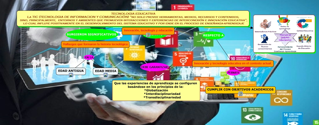 Este Cmap, tiene información relacionada con: MAPA 4, Innovación, tecnología y educación DEBE GARANTIZAR Que las experiencias de aprendizaje se configuren basándose en los principios de la: *Globalización *Interdisciplinariedad *Transdisciplinariedad, Hallazgos que formaron la historia tecnológica EN LA EDAD MEDIA, TECNOLOGIA EDUCATIVA La TIC (TECNOLOGIA DE INFORMACION Y COMUNICACIÓN) “no solo provee herramientas, medios, recursos y contenidos, sino, principalmente, entornos y ambientes que promueven interacciones y experiencias de interconexión e innovación educativa”, lo cual influye positivamente en el desenvolvimiento del sistema educativo y por ende en el proceso de enseñanza-aprendizaje EN CUANTO A Innovación, tecnología y educación, Hallazgos que formaron la historia tecnológica EN LA EDAD ANTIGUA, TECNOLOGIA EDUCATIVA La TIC (TECNOLOGIA DE INFORMACION Y COMUNICACIÓN) “no solo provee herramientas, medios, recursos y contenidos, sino, principalmente, entornos y ambientes que promueven interacciones y experiencias de interconexión e innovación educativa”, lo cual influye positivamente en el desenvolvimiento del sistema educativo y por ende en el proceso de enseñanza-aprendizaje SURGIERON SIGNIFICATIVOS Hallazgos que formaron la historia tecnológica, Innovación y tecnología educativa en el contexto actual. PERMITE CUMPLIR CON OBJETIVOS ACADEMICOS, TECNOLOGIA EDUCATIVA La TIC (TECNOLOGIA DE INFORMACION Y COMUNICACIÓN) “no solo provee herramientas, medios, recursos y contenidos, sino, principalmente, entornos y ambientes que promueven interacciones y experiencias de interconexión e innovación educativa”, lo cual influye positivamente en el desenvolvimiento del sistema educativo y por ende en el proceso de enseñanza-aprendizaje ????, TECNOLOGIA EDUCATIVA La TIC (TECNOLOGIA DE INFORMACION Y COMUNICACIÓN) “no solo provee herramientas, medios, recursos y contenidos, sino, principalmente, entornos y ambientes que promueven interacciones y experiencias de interconexión e innovación educativa”, lo cual influye positivamente en el desenvolvimiento del sistema educativo y por ende en el proceso de enseñanza-aprendizaje RESPECTO A Innovación y tecnología educativa en el contexto actual.