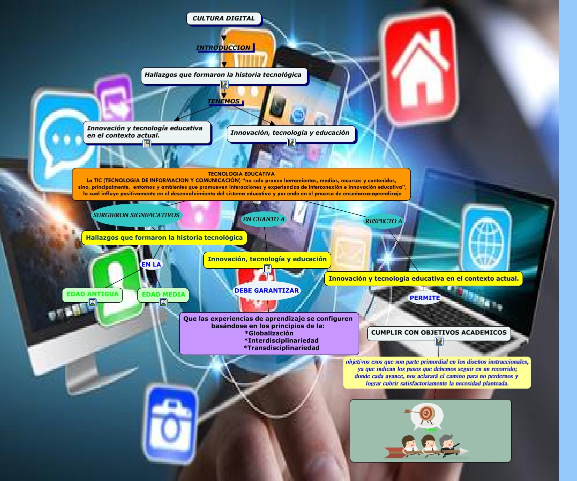 Este Cmap, tiene información relacionada con: MAPA consolidado, Innovación, tecnología y educación DEBE GARANTIZAR Que las experiencias de aprendizaje se configuren basándose en los principios de la: *Globalización *Interdisciplinariedad *Transdisciplinariedad, Hallazgos que formaron la historia tecnológica EN LA EDAD ANTIGUA, TECNOLOGIA EDUCATIVA La TIC (TECNOLOGIA DE INFORMACION Y COMUNICACIÓN) “no solo provee herramientas, medios, recursos y contenidos, sino, principalmente, entornos y ambientes que promueven interacciones y experiencias de interconexión e innovación educativa”, lo cual influye positivamente en el desenvolvimiento del sistema educativo y por ende en el proceso de enseñanza-aprendizaje SURGIERON SIGNIFICATIVOS Hallazgos que formaron la historia tecnológica, CULTURA DIGITAL INTRODUCCION Hallazgos que formaron la historia tecnológica, Innovación y tecnología educativa en el contexto actual. PERMITE CUMPLIR CON OBJETIVOS ACADEMICOS, TECNOLOGIA EDUCATIVA La TIC (TECNOLOGIA DE INFORMACION Y COMUNICACIÓN) “no solo provee herramientas, medios, recursos y contenidos, sino, principalmente, entornos y ambientes que promueven interacciones y experiencias de interconexión e innovación educativa”, lo cual influye positivamente en el desenvolvimiento del sistema educativo y por ende en el proceso de enseñanza-aprendizaje RESPECTO A Innovación y tecnología educativa en el contexto actual., TECNOLOGIA EDUCATIVA La TIC (TECNOLOGIA DE INFORMACION Y COMUNICACIÓN) “no solo provee herramientas, medios, recursos y contenidos, sino, principalmente, entornos y ambientes que promueven interacciones y experiencias de interconexión e innovación educativa”, lo cual influye positivamente en el desenvolvimiento del sistema educativo y por ende en el proceso de enseñanza-aprendizaje EN CUANTO A Innovación, tecnología y educación, CUMPLIR CON OBJETIVOS ACADEMICOS objetivos esos que son parte primordial en los diseños instruccionales, ya que indican los pasos que debemos seguir en un recorrido; donde cada avance, nos aclarará el camino para no perdernos y lograr cubrir satisfactoriamente la necesidad planteada. ????, Hallazgos que formaron la historia tecnológica TENEMOS Innovación, tecnología y educación, Hallazgos que formaron la historia tecnológica TENEMOS Innovación y tecnología educativa en el contexto actual., Hallazgos que formaron la historia tecnológica EN LA EDAD MEDIA