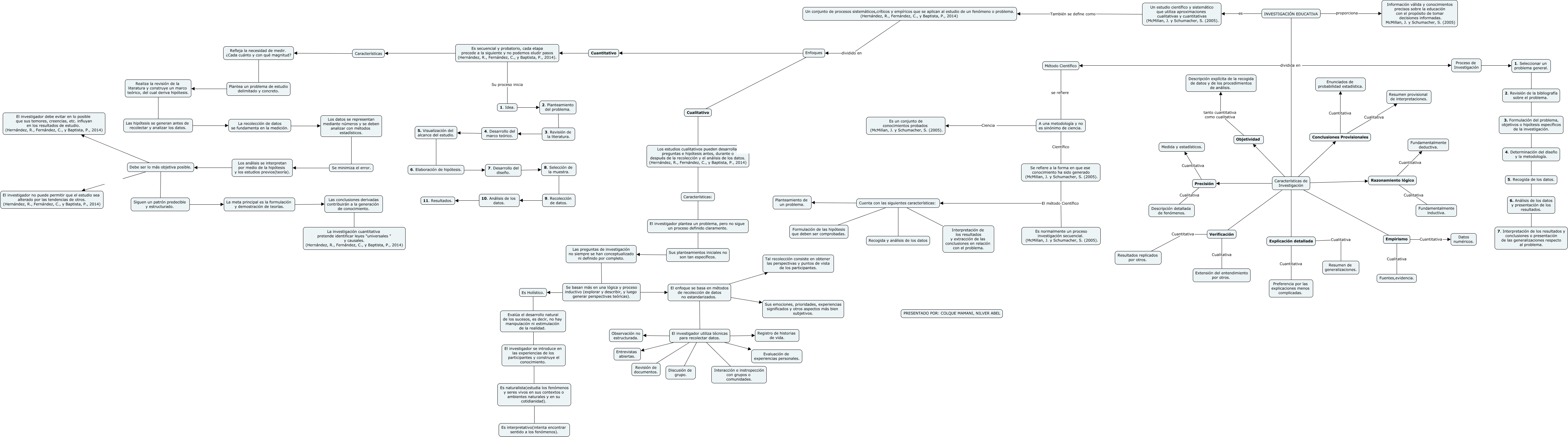 Este Cmap, tiene información relacionada con: Investigación Educativa, Un estudio científico y sistemático que utiliza aproximaciones cualitativas y cuantitativas (McMillan, J. y Schumacher, S. (2005). También se define como Un conjunto de procesos sistemáticos,críticos y empíricos que se aplican al estudio de un fenómeno o problema. (Hernández, R., Fernández, C., y Baptista, P., 2014), 4. Desarrollo del marco teórico. 5. Visualización del alcance del estudio., Explicación detallada Cualitativa Resumen de generalizaciones., El investigador utiliza técnicas para recolectar datos. Revisión de documentos., Enfoques Cualitativo, Las conclusiones derivadas contribuirán a la generación de conocimiento. La investigación cuantitativa pretende identificar leyes "universales " y causales. (Hernández, R., Fernández, C., y Baptista, P., 2014), 10. Análisis de los datos. 11. Resultados., La meta principal es la formulación y demostración de teorías. Las conclusiones derivadas contribuirán a la generación de conocimiento., Las preguntas de investigación no siempre se han conceptualizado ni definido por completo. Se basan más en una lógica y proceso inductivo (explorar y describir, y luego generar perspectivas teóricas)., Un conjunto de procesos sistemáticos,críticos y empíricos que se aplican al estudio de un fenómeno o problema. (Hernández, R., Fernández, C., y Baptista, P., 2014) dividido en Enfoques, Empirismo Cuantitativa Datos numéricos., Verificación Cuantitativa Resultados replicados por otros., Enfoques Cuantitativo, Características de Investigación Conclusiones Provisionales, Se basan más en una lógica y proceso inductivo (explorar y describir, y luego generar perspectivas teóricas). El enfoque se basa en métodos de recolección de datos no estandarizados., Cuantitativo Es secuencial y probatorio, cada etapa precede a la siguiente y no podemos eludir pasos (Hernández, R., Fernández, C., y Baptista, P., 2014)., Conclusiones Provisionales Cualitativa Resumen provisional de interpretaciones., Conclusiones Provisionales Cuantitativa Enunciados de probabilidad estadística., Es secuencial y probatorio, cada etapa precede a la siguiente y no podemos eludir pasos (Hernández, R., Fernández, C., y Baptista, P., 2014). Su proceso inicia 1. Idea., Los estudios cualitativos pueden desarrollar preguntas e hipótesis antes, durante o después de la recolección y el análisis de los datos. (Hernández, R., Fernández, C., y Baptista, P., 2014) Características: