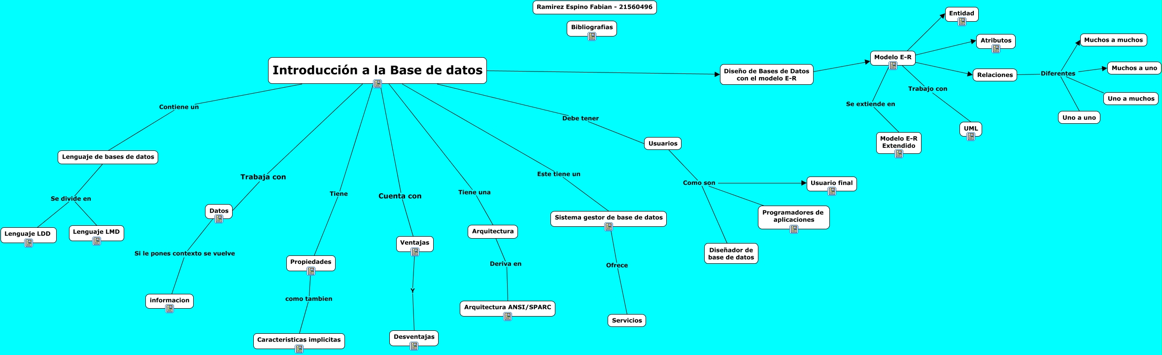 Este Cmap, tiene información relacionada con: MapaFabian, Modelo E-R Se extiende en Modelo E-R Extendido, Usuarios Como son Programadores de aplicaciones, Usuarios Como son Diseñador de base de datos, Propiedades como tambien Caracteristicas implicitas, Lenguaje de bases de datos Se divide en Lenguaje LMD, Modelo E-R ???? Relaciones, Introducción a la Base de datos Cuenta con Ventajas, Relaciones Diferentes Uno a uno, Introducción a la Base de datos ???? Diseño de Bases de Datos con el modelo E-R, Usuarios Como son Usuario final, Introducción a la Base de datos Tiene Propiedades, Sistema gestor de base de datos Ofrece Servicios, Diseño de Bases de Datos con el modelo E-R Deriva a Modelo E-R, Modelo E-R ???? Entidad, Ventajas Y Desventajas, Modelo E-R Trabajo con UML, Introducción a la Base de datos Este tiene un Sistema gestor de base de datos, Relaciones Diferentes Muchos a uno, Introducción a la Base de datos Contiene un Lenguaje de bases de datos, Relaciones Diferentes Uno a muchos