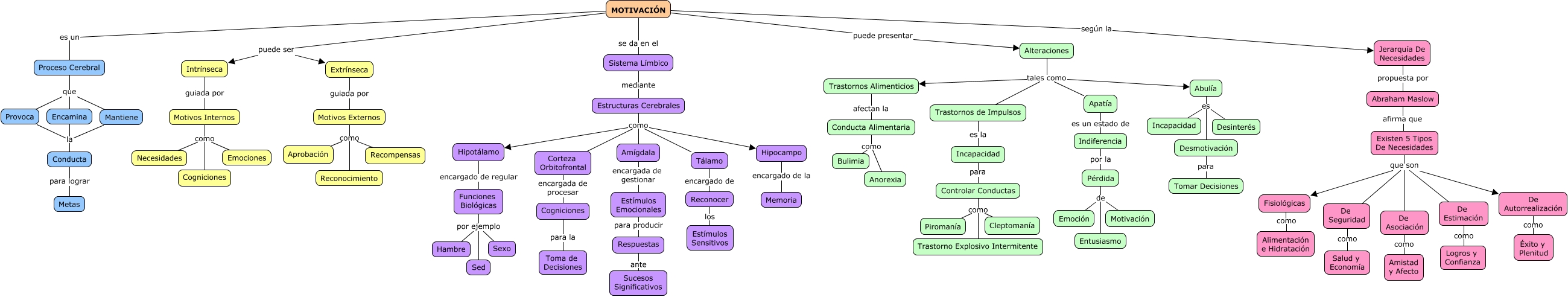 Este Cmap, tiene información relacionada con: Motivación Mapa Grupal, Encamina la Conducta, Alteraciones tales como Abulía, Trastornos de Impulsos es la Incapacidad, Apatía es un estado de Indiferencia, Motivos Internos como Necesidades, MOTIVACIÓN puede ser Intrínseca, Pérdida de Emoción, Incapacidad para Controlar Conductas, Motivos Externos como Recompensas, Conducta para lograr Metas, Controlar Conductas como Piromanía, Fisiológicas como Alimentación e Hidratación, Estructuras Cerebrales como Amígdala, Existen 5 Tipos De Necesidades que son De Seguridad, MOTIVACIÓN se da en el Sistema Límbico, Conducta Alimentaria como Anorexia, De Seguridad como Salud y Economía, Cogniciones para la Toma de Decisiones, Motivos Internos como Emociones, Hipotálamo encargado de regular Funciones Biológicas