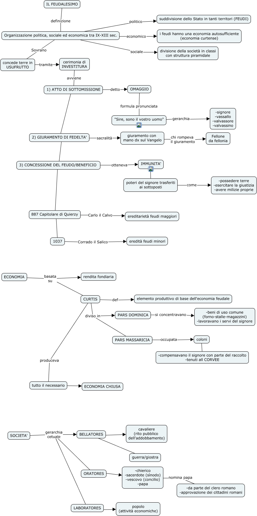 Questa Cmap, creata con IHMC CmapTools, contiene informazioni relative a: Feudalesimo, BELLATORES ???? guerra/giostra, OMAGGIO formula pronunciata "Sire, sono il vostro uomo", Organizzazione politica, sociale ed economica tra IX-XIII sec. economico i feudi hanno una economia autosufficiente (economia curtense), LABORATORES ???? popolo (attività economiche), ORATORES ???? -chierico -sacerdote (sìnodo) -vescovo (concilio) -papa, SOCIETA' gerarchia cetuale BELLATORES, 1037 Corrado il Salico eredità feudi minori, giuramento con mano dx sul Vangelo chi rompeva il giuramento Fellone da fellonia, Organizzazione politica, sociale ed economica tra IX-XIII sec. politico suddivisione dello Stato in tanti territori (FEUDI), 1) ATTO DI SOTTOMISSIONE detto OMAGGIO, concede terre in USUFRUTTO tramite cerimonia di INVESTITURA, "Sire, sono il vostro uomo" gerarchia -signore -vassallo -valvassore -valvassino, CURTIS diviso in PARS MASSARICIA, BELLATORES ???? cavaliere (rito pubblico dell'addobbamento), 3) CONCESSIONE DEL FEUDO/BENEFICIO era 887 Capitolare di Quierzy, poteri del signore trasferiti ai sottoposti come -possedere terre -esercitare la giustizia -avere milizie proprie, SOCIETA' gerarchia cetuale ORATORES, PARS MASSARICIA occupata coloni, 2) GIURAMENTO DI FEDELTA' sacralità giuramento con mano dx sul Vangelo, CURTIS def elemento produttivo di base dell'economia feudale
