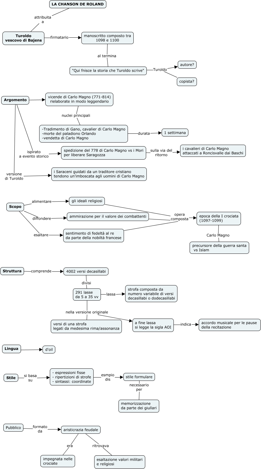 Questa Cmap, creata con IHMC CmapTools, contiene informazioni relative a: 3_La Chanson de Roland, manoscritto composto tra 1098 e 1100 al termina "Qui fnisce la storia che Turoldo scrive", aristicrazia feudale era impegnata nelle crociate, "Qui fnisce la storia che Turoldo scrive" Turoldo autore?, 291 lasse da 5 a 35 vv lassa strofa composta da numero variabile di versi decasillabi o dodecasillabi, aristicrazia feudale ritrovava esaltazione valori militari e religiosi, -Tradimento di Gano, cavalier di Carlo Magno -morte del paladiono Orlando -vendetta di Carlo Magno durata 1 settimana, Argomento ???? vicende di Carlo Magno (771-814) rielaborate in modo leggendario, "Qui fnisce la storia che Turoldo scrive" Turoldo copista?, spedizione del 778 di Carlo Magno vs i Mori per liberare Saragozza sulla via del ritorno i cavalieri di Carlo Magno attaccati a Roncisvalle dai Baschi, 291 lasse da 5 a 35 vv nella versione originale versi di una strofa legati da medesima rima/assonanza, Turoldo vescovo di Bajens firmatario manoscritto composto tra 1098 e 1100, Scopo alimentare gli ideali religiosi, 291 lasse da 5 a 35 vv nella versione originale a fine lassa si legge la sigla AOI, a fine lassa si legge la sigla AOI indica accordo musicale per le pause della recitazione, Scopo diffondere ammirazione per il valore dei combattenti, Argomento ispirato a evento storico spedizione del 778 di Carlo Magno vs i Mori per liberare Saragozza, sentimento di fedeltà al re da parte della nobiltà francese opera composta epoca della I crociata (1097-1099), epoca della I crociata (1097-1099) Carlo Magno precursore della guerra santa vs Islam, ammirazione per il valore dei combattenti opera composta epoca della I crociata (1097-1099), - espressioni fisse - ripertizioni di strofe - sintassi: coordinate esmpio dis stile formulare